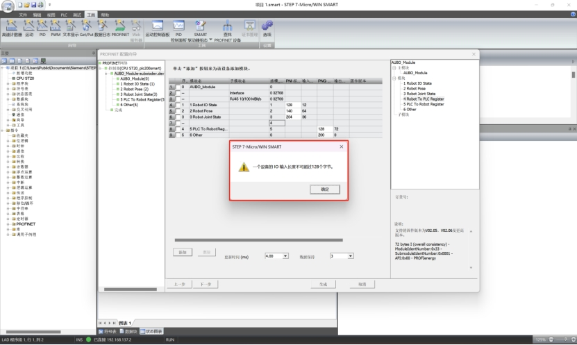 解决方案:出现下面的弹窗,代表 PLC 的内存不够大,以下图为例,此 PLC 的输入最大允许 128 字节的数据,但是槽 1 到槽 4 加起来一共大于了 128 字节,所以在拖入槽 4 的时候会弹此弹窗,且槽 4 无法正确的加载。解决方法是需要更换性能和配置更好的 PLC ,或者删除不需要的槽,只加载需要的槽。