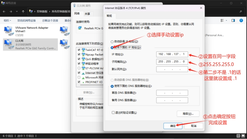 本教程中的 PLC 的 IP 地址为 192.168.137.2 ,且它是连接在 PCIE 有线网卡上的。此时需要把这张有线网卡的 IP 配置为 192.168.137.X (X 的取值范围是 1~255,且不能和 PLC 的 IP 重复)。