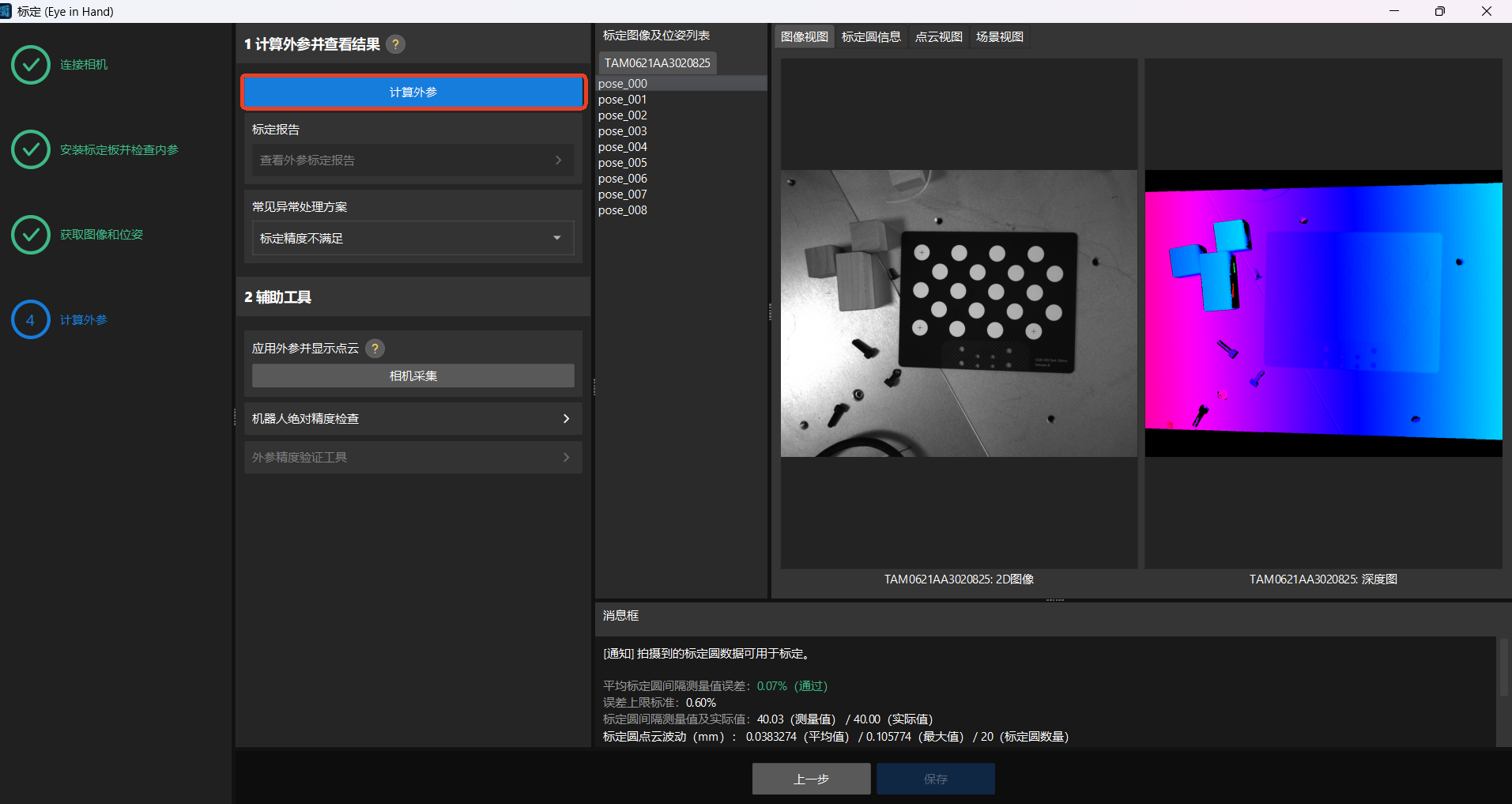 选择使用的标定板型号,并按软件引导检查标定板位置、图像。