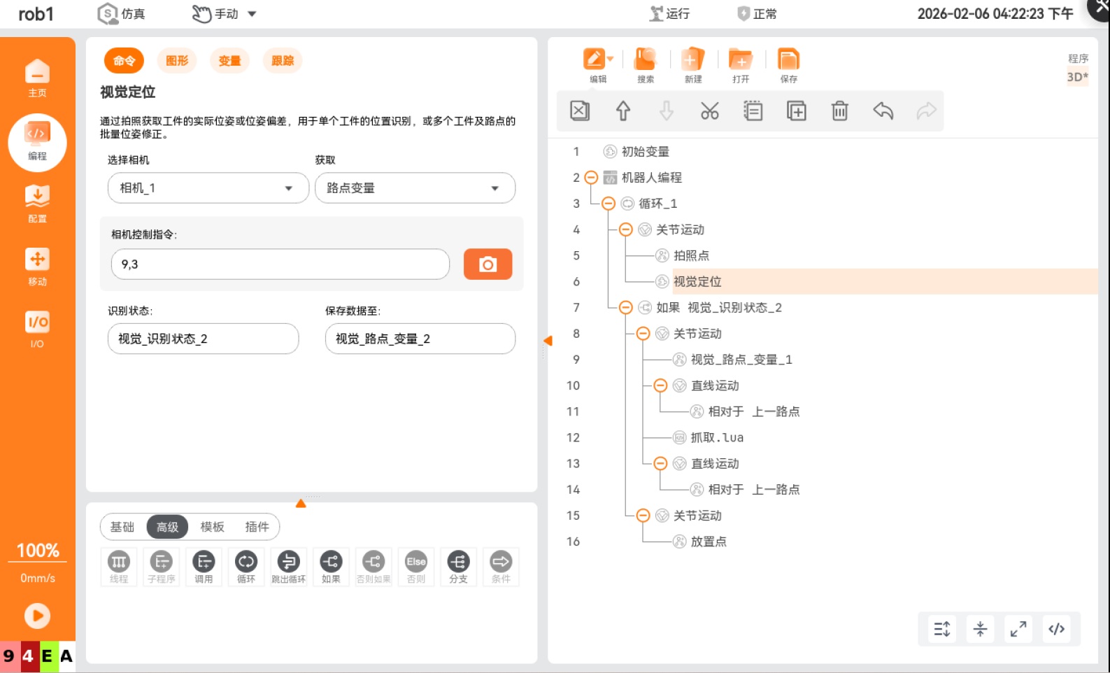 移动机械臂使相机可以拍摄到被抓取范围,设置该点位为拍照点,视觉定位节点选择路点变量,并输入对应抓取物的代码。