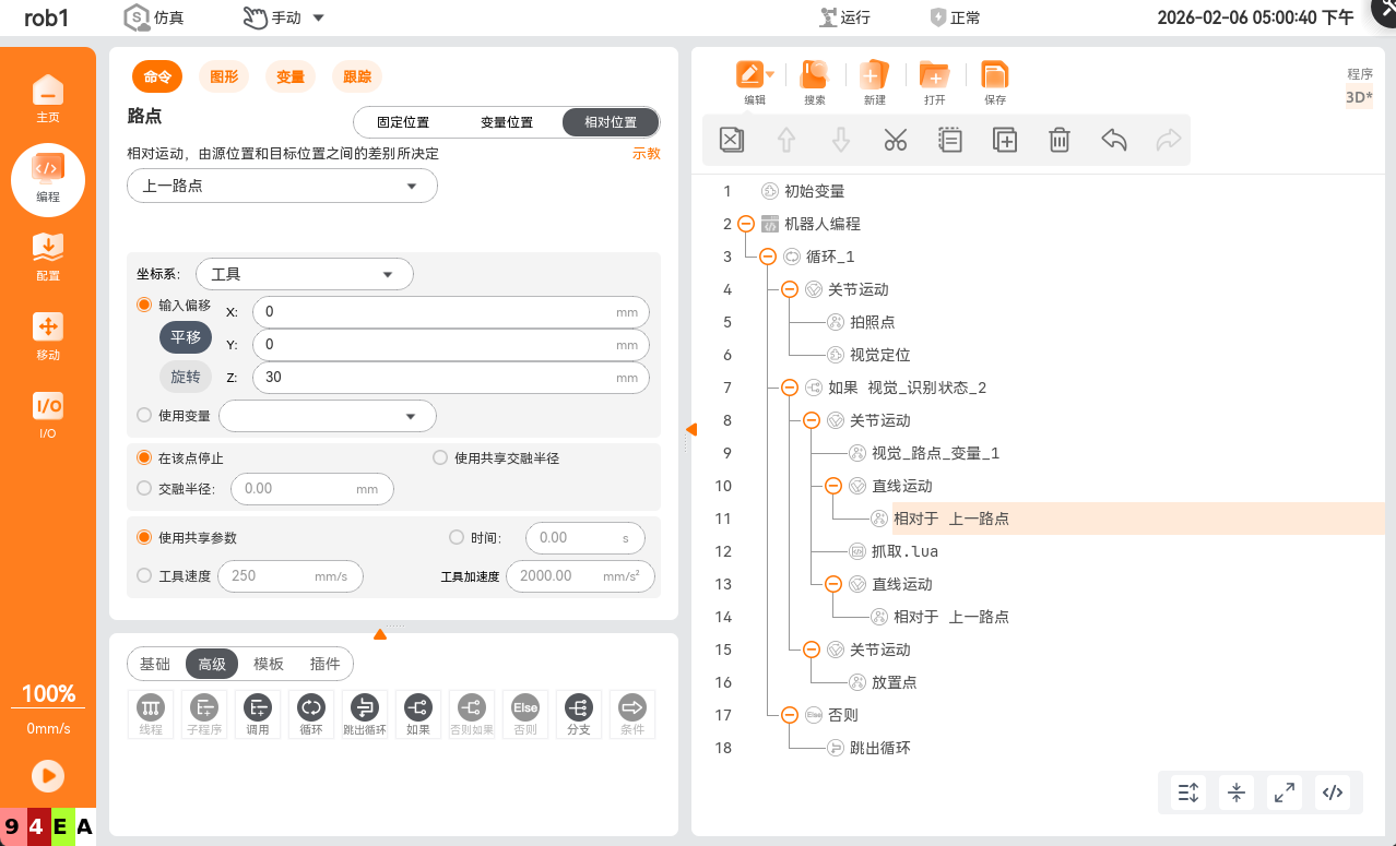 直线运动至适合抓取位置,通常是设置工具坐标系 Z+ 使夹爪垂直抓取后 Z- 返回抓取点再移动至放置点(避免异常移动导致碰撞)。