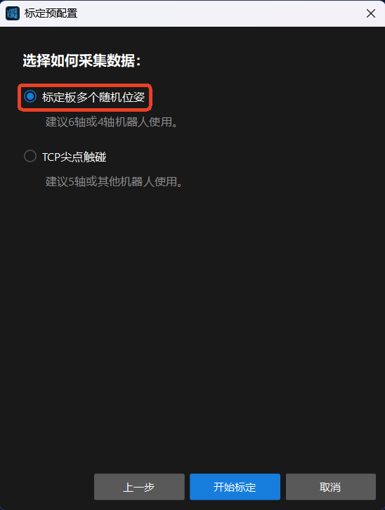 并依次选择眼在手、手动标定、标定板多个随机位姿。