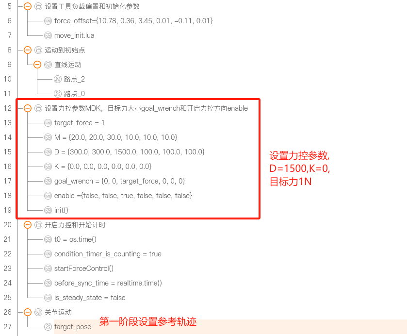 实例7第一段:Z 方向运动达到稳定状态,设置参考轨迹,参考轨迹终点在接触桌面上方大约1mm 处,利用实例6力引导效果,达到平衡状态。