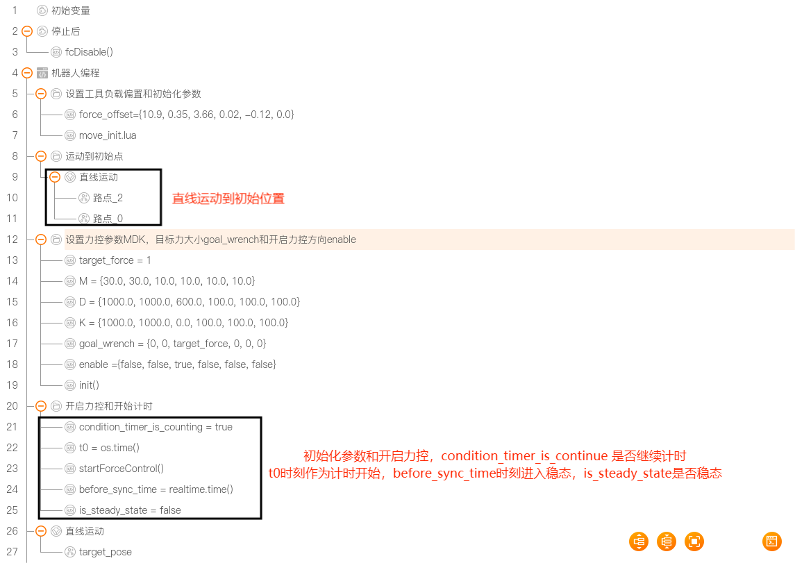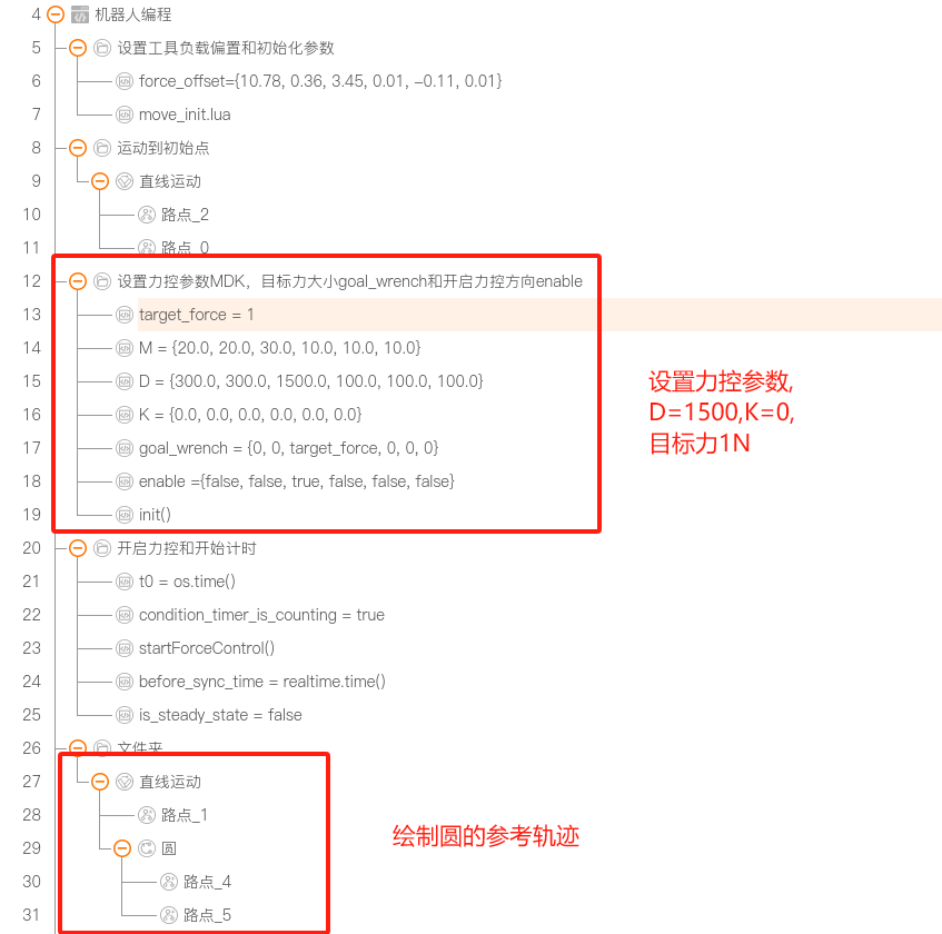 • 第二段,以力平衡点为基准点,在基准点 Z 不变的情况下,设置另外两个参考点,这三个点构成一条圆的轨迹。将设置好的圆的参考轨迹给力控,根据力控反馈的力的值修正圆的轨迹,时刻保持在 1N 左右直到圆形绘制完成。结束条件包括 运动超时、运动到位、力控超出最大力达到保护性停止。