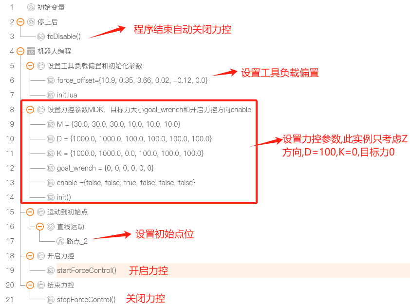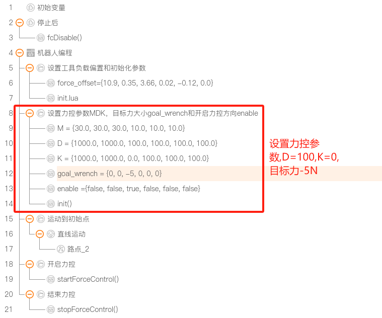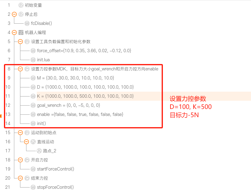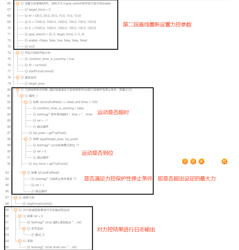• 设置了最大力条件,力超过最大限制,满足 isCondFullfiled(),机械臂停止运动。