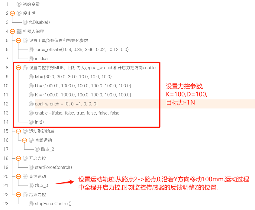 • 实例说明 : 在实例 1 演示的拖动中增加目标力 -5N,机械臂会受目标力影响,一直朝着能使目标力平衡的方向移动,直到受到相等的外力使机械臂达到平衡状态,机械臂停止运动。该实例中,目标力为 -5N,机械臂向下运动,直到给工具向上 5N 的外力使之达到平衡状态。