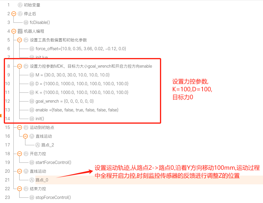 • 实例说明:在 实例 2 演示的弹簧中添加参考轨迹,沿着 Y+ 方向移动 100mm。机械臂全程处于弹簧状态,在朝着 Y+ 方向移动时,施加 Z 方向外力后,机械臂会在弹簧力作用下,回到原来 Z 的位置,Move 结束后,仍处于弹簧状态。