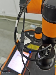 将电动夹爪线缆航插头的一端插到电动夹爪的航插母头上,并旋转拧紧固定螺母(图 26);线缆另一端穿过底盘上台面过线孔,棕色为正极插入接口板 DC24V 输出正极,蓝色为负极插入接口板 DC24V 输出正极,白色为 485A 接口连接 USB 转 485 模块 A 接口,黑色为 485B 接口连接 USB 转 485 模块 B 接口(图 27),将 USB 转 485 模块 USB 公头插到接口面板的 USB 接口上(图 28)。