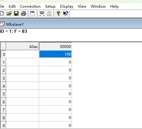 设置地址值,如在地址 0 设置值为 100,寄存器类型为 03 保持寄存器。