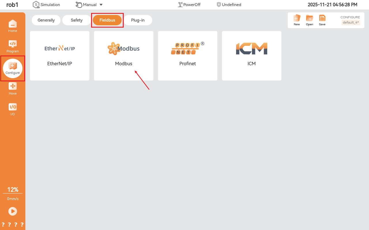Open ARCS software, Modbus is located at Configuration > Fieldbus -> Modbus.