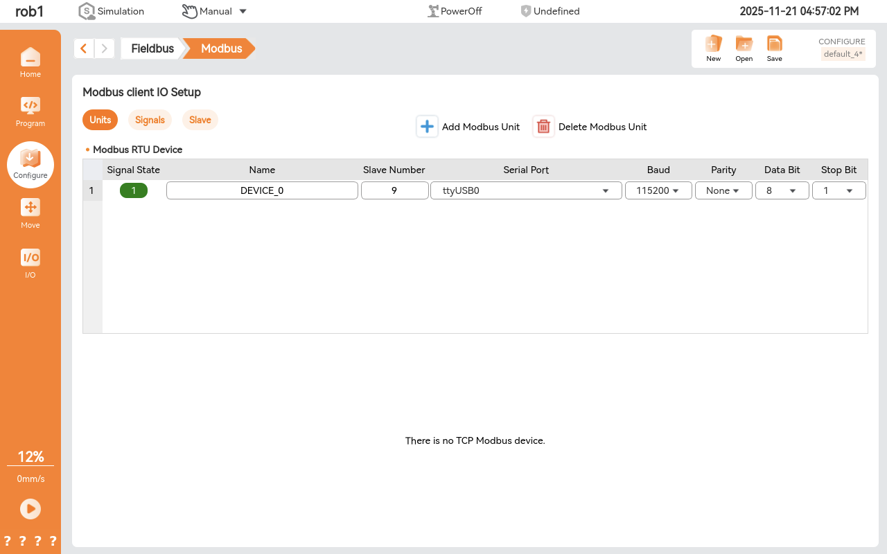 - Units page, click Add Modbus Unit > RTU mode.
