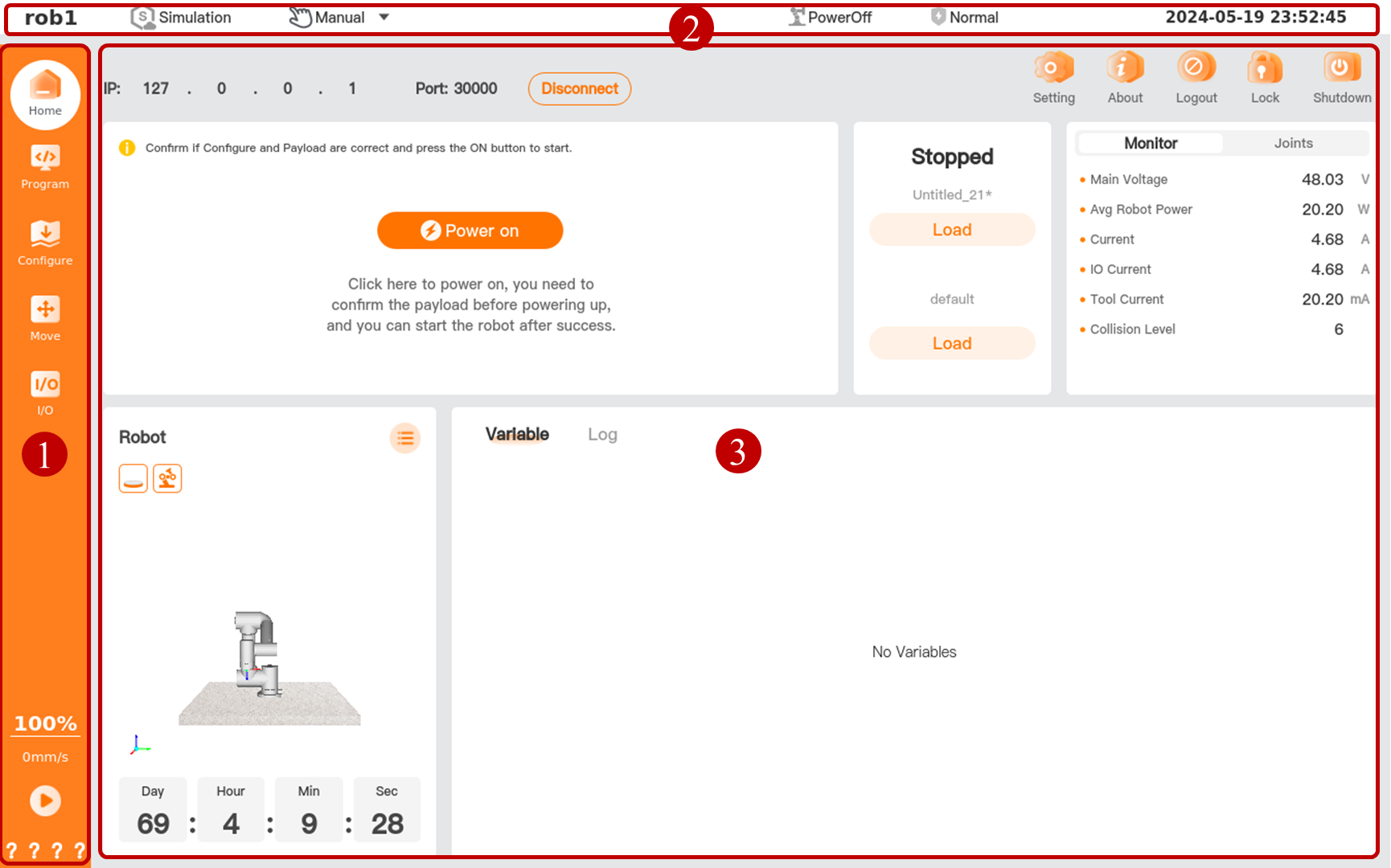 2SimulationAllow you to switch between a simulated robot arm and a real robot arm. When you turn on the Simulation button, the color of the simulation icon changes, and the system enters the simulation mode.