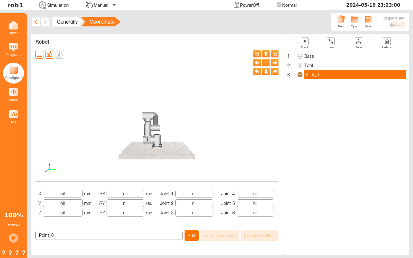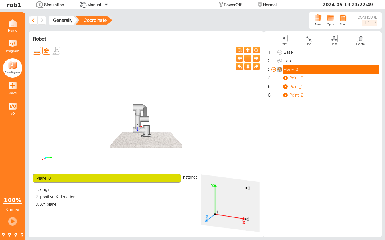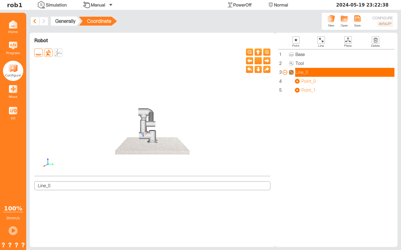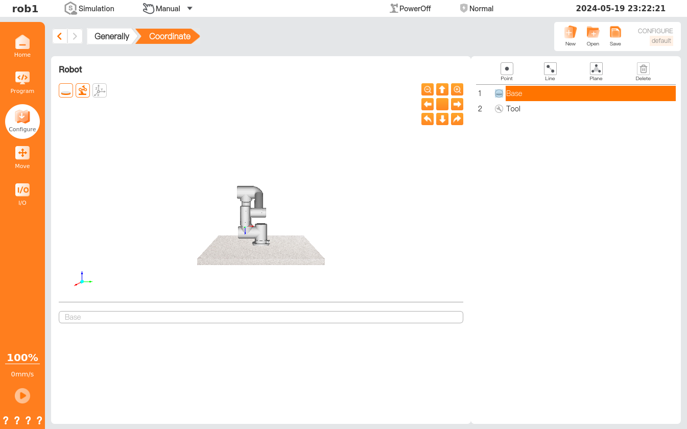 On the "Configure > General > Coordinate System" interface, users can create a new coordinate system in the form of a point, line, or plane. The new coordinate system is positioned by the position of TCP. After selecting the method to create a new coordinate system, users can show the position of the coordinate system by moving TCP to the target position/pose.