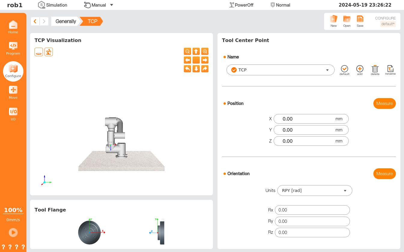 [TCP] page allows setting of tool coordinate system. Each TCP contains translation and rotation parameters set relative to the center of the tool flange: X, Y, and Z coordinates specify the TCP position; RX, RY, and RZ coordinates define the TCP direction. When all values, including direction, are zero, TCP coincides with the center point of the tool flange.