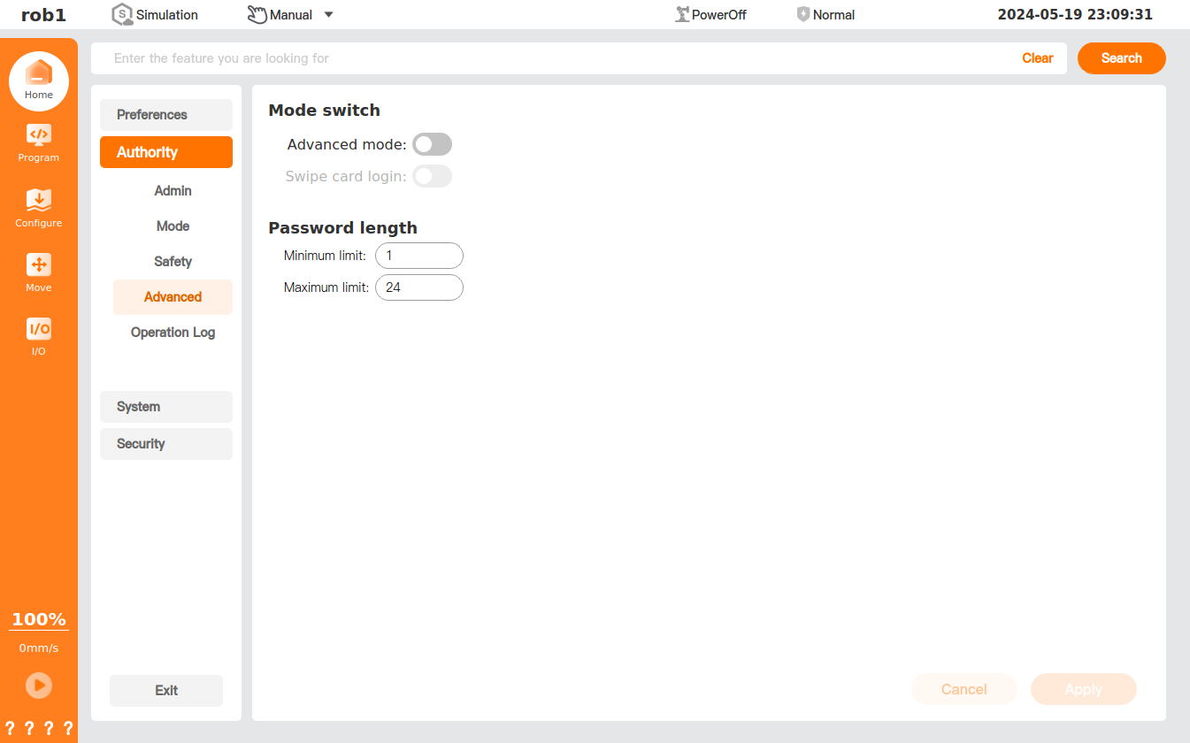 AuboStudio works in classic mode by default. You can switch to the advanced mode in the [Advanced] page after setting the admin password. When using this feature, please ensure that the user authority is properly configured and managed according to the instructions in the relevant documentation or official guides.