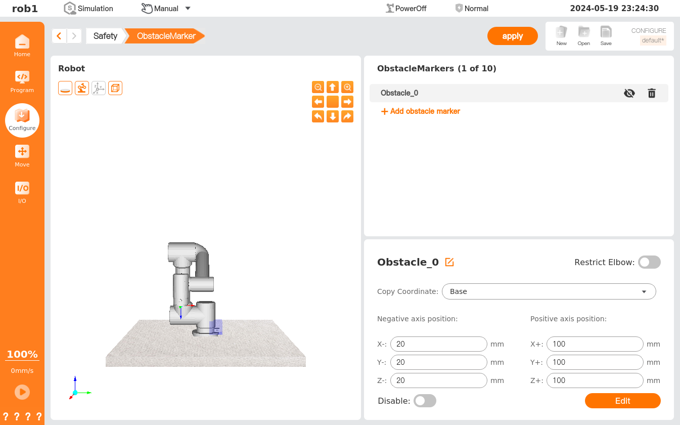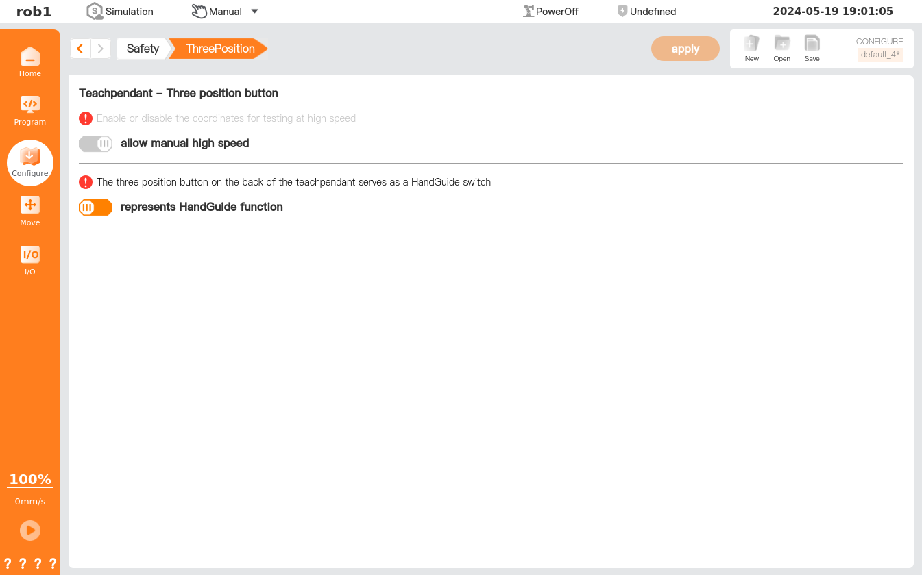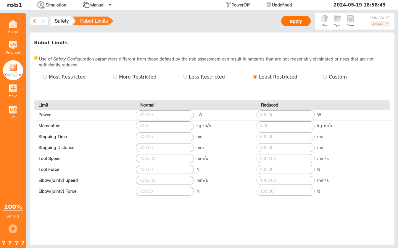 On the [Robot Limits], users can set the limits for robot hardware parameters, including power, momentum, stopping time, stopping distance, tool speed, tool force, elbow (joint 3) speed, and elbow (joint 3) force. The system provides several preset values, and the users can also use custom settings as needed. However, the safety configuration parameters are different from those defined in the risk assessment, which may lead to hazards not being reasonably eliminated or risks not being sufficiently reduced.