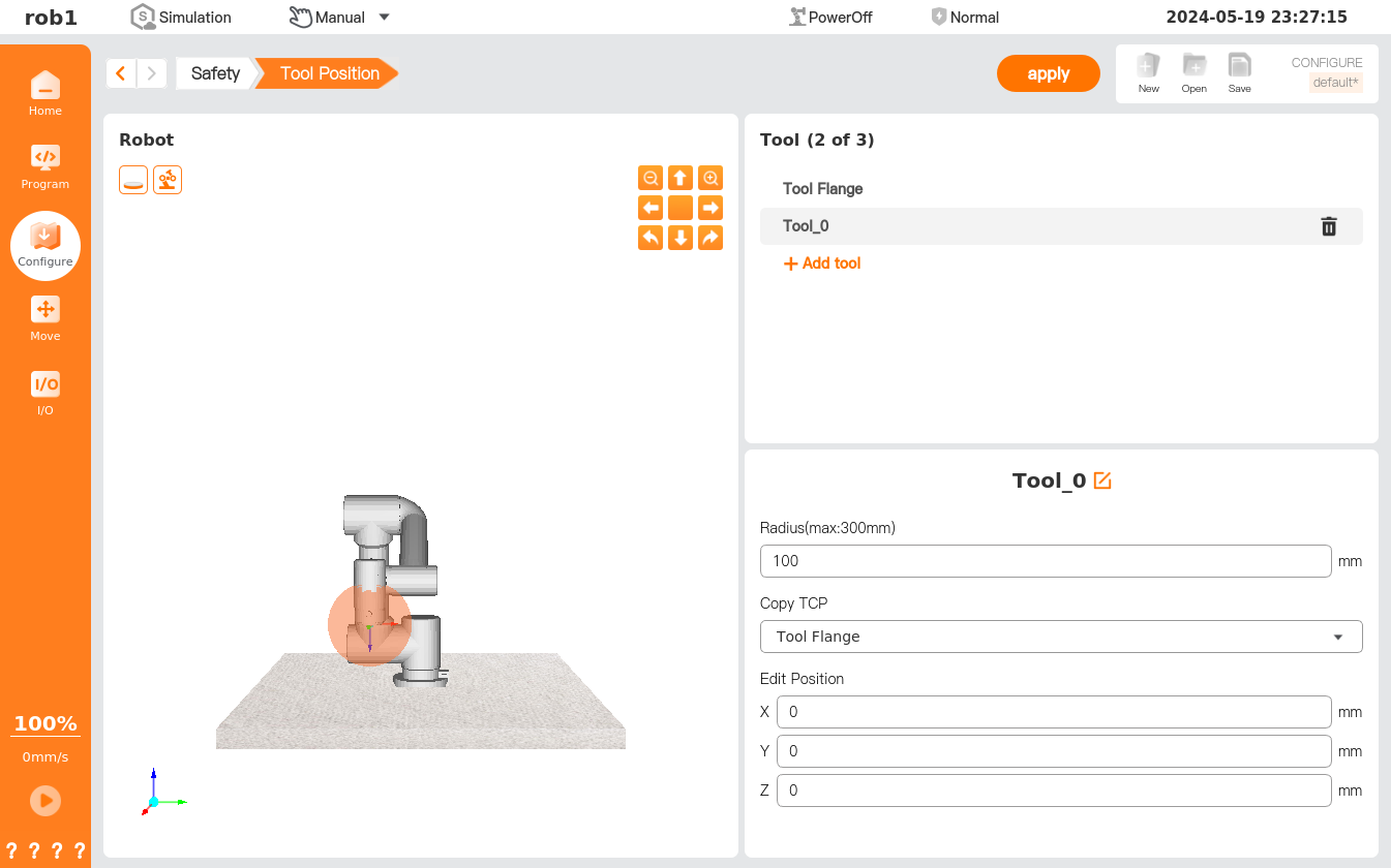 In the [Tool Position] page, users can set the spherical envelope of end-of-arm tooling (EOAT) and simulate the shape of the tool through the spherical envelope. This feature is designed to protect the end-of-arm tooling (EOAT) by using the spherical envelope to monitor collisions as TCP approaches a safety plane or an obstacle, thereby protecting the integrity of the end-of-arm tooling (EOAT).