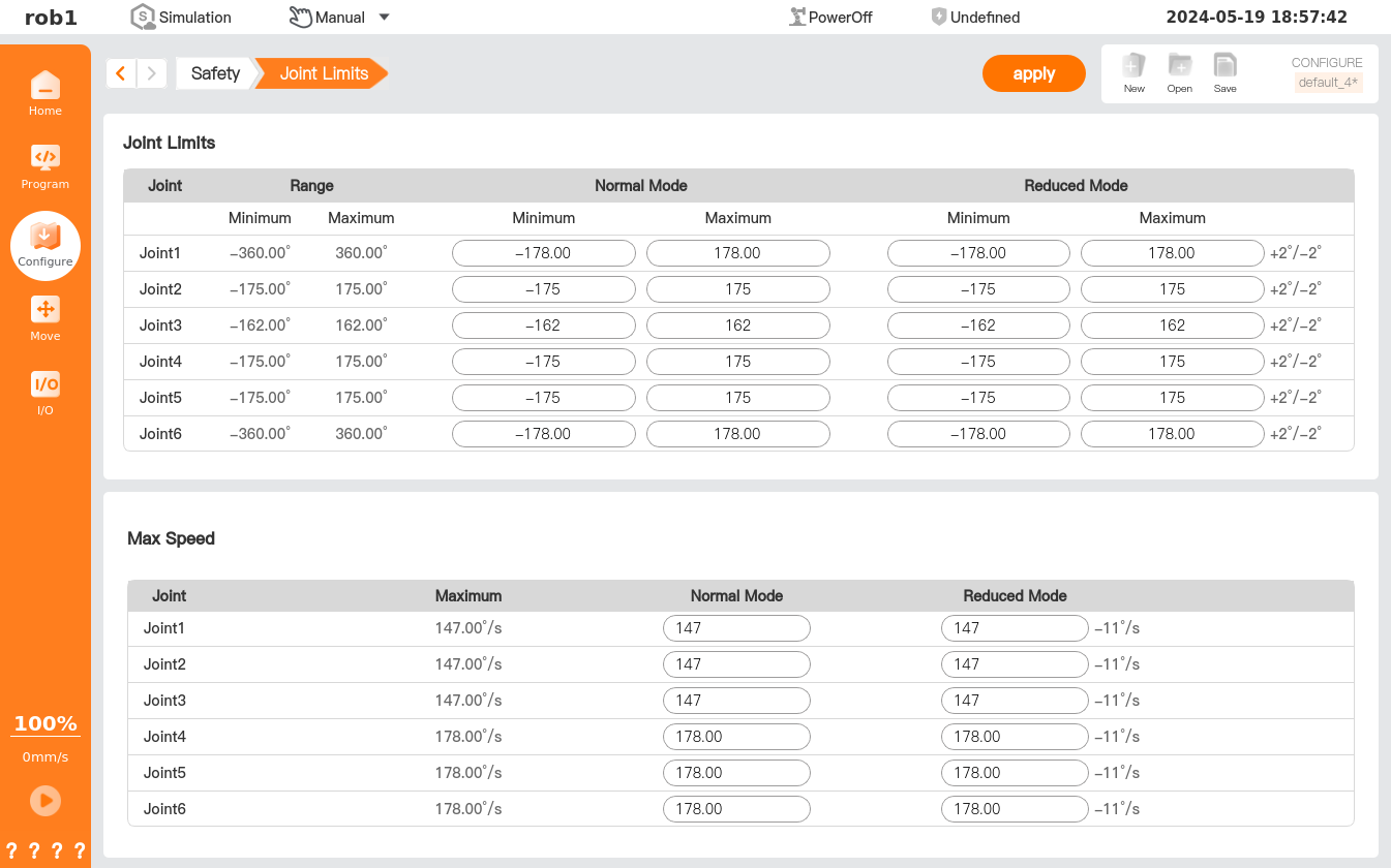 2. The default values of joint maximum value, joint minimum value, and joint max speed limit are the maximum ranges and can only be modified by the user within the default ranges.
