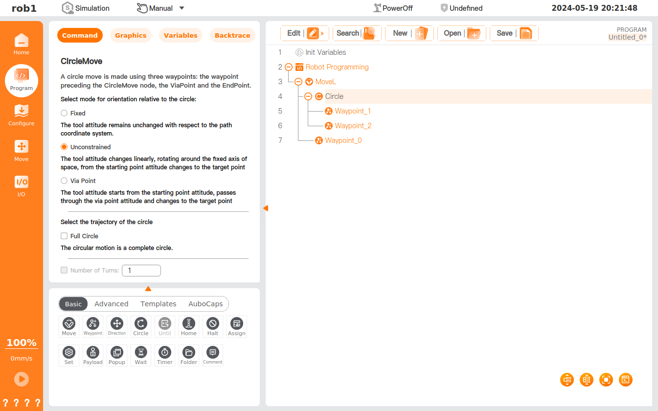 - Full Circle: When this option is checked, the robot will move in a complete circle determined by the three-point method. When this option is unchecked, the robot moves in a circle between the starting point, the via point, and the end point and returns to the starting point in a straight line after reaching the end point.