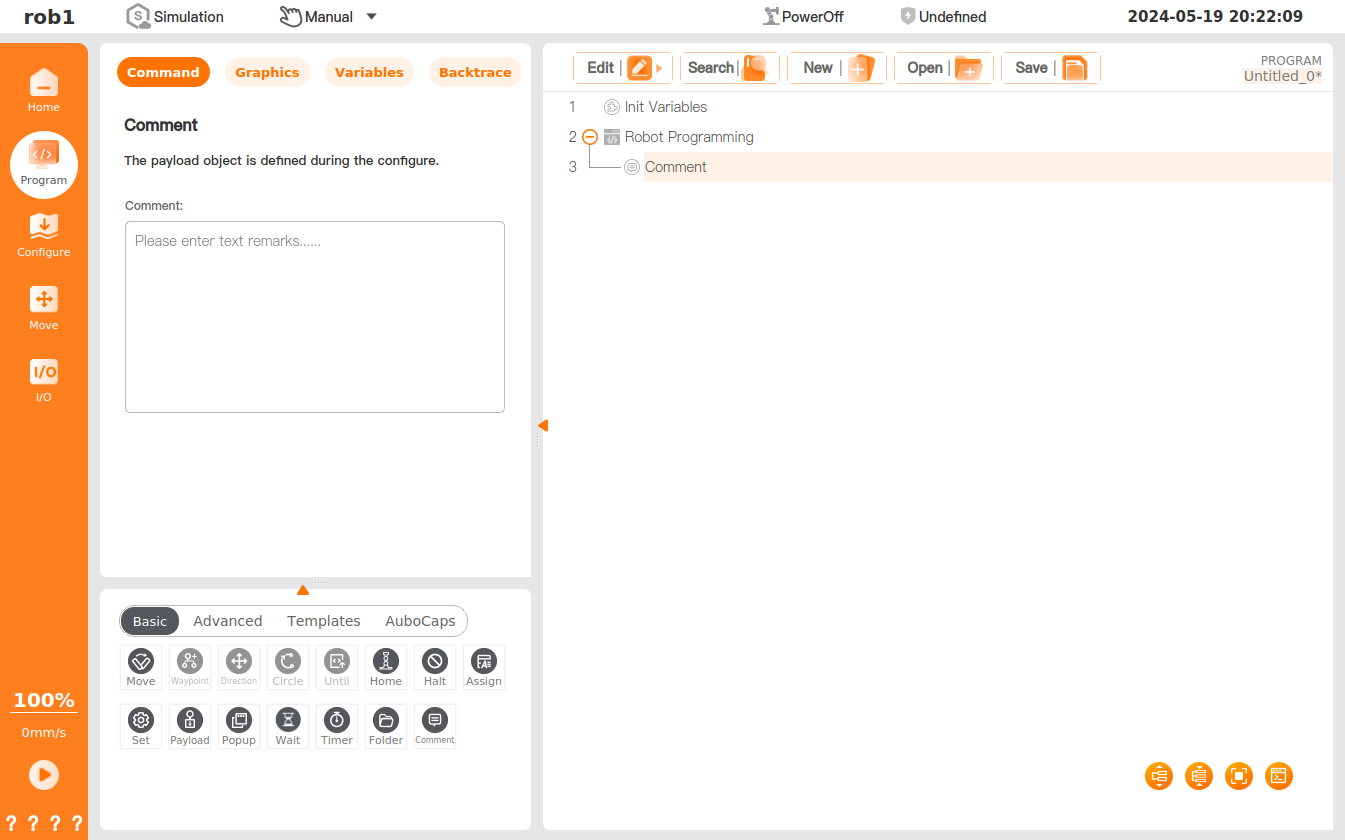 Basic program node, namely, the basic node that makes up the program, includes node commands indicating waypoint, direction, comment, folder, etc. For example, the commands indicating waypoint and direction can be used to determine the motion track of the robot. And the commands indicating comment and folder can assist users in managing the program, and their proper use enables good readability of the program.