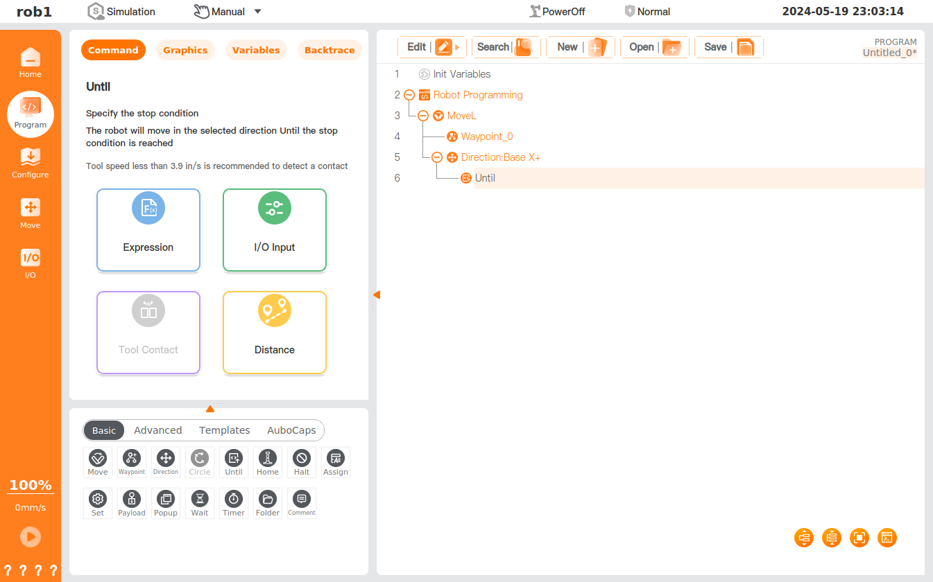 The [Until] command sets the motion stop condition. Multiple stop conditions can be added for a single action. When the first stop condition is met, the motion stops. Users can add the [Until] node under the [Direction] node or the [Waypoint] node to set the stop condition of the robot.