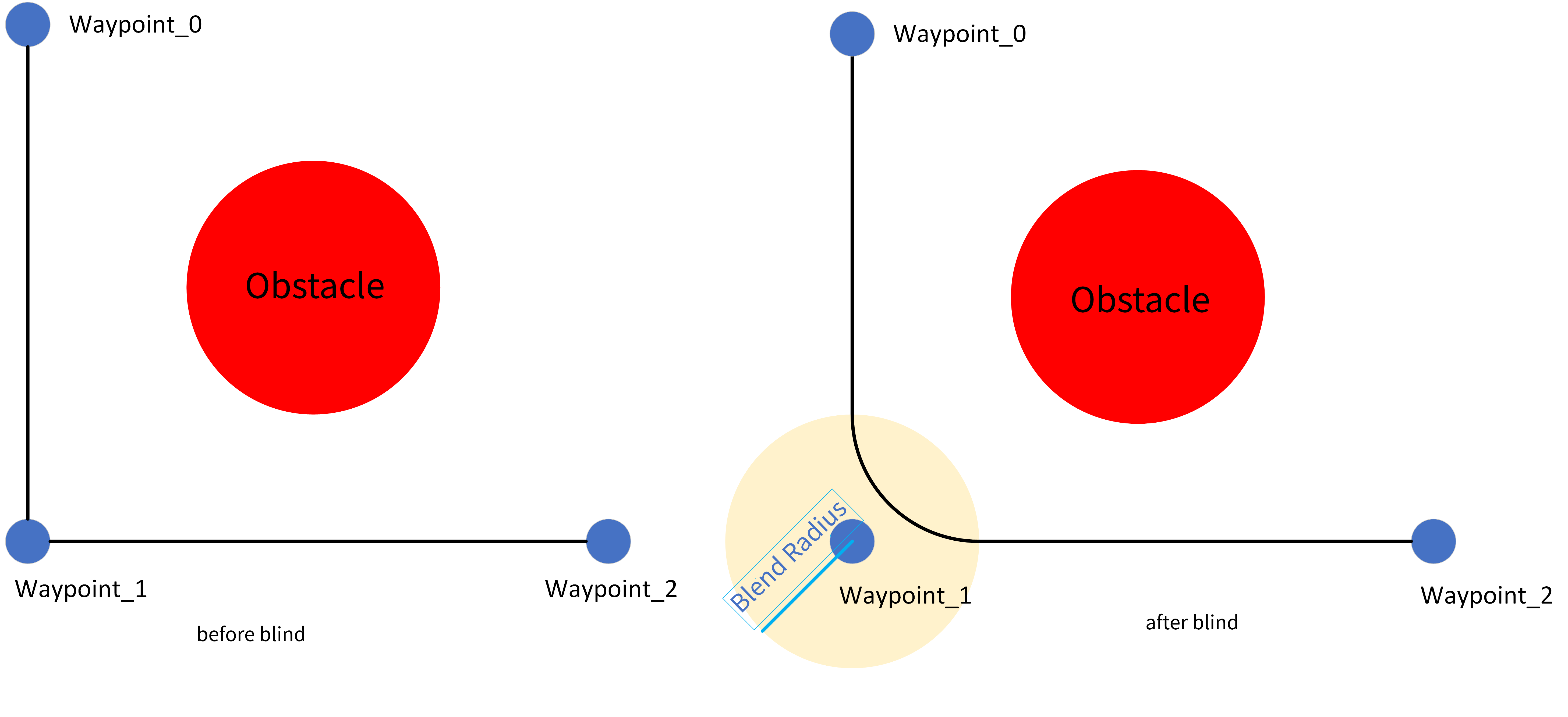 - Blend with radius: If there are other waypoints after the node, the robot will not stop but run smoothly to the next node.