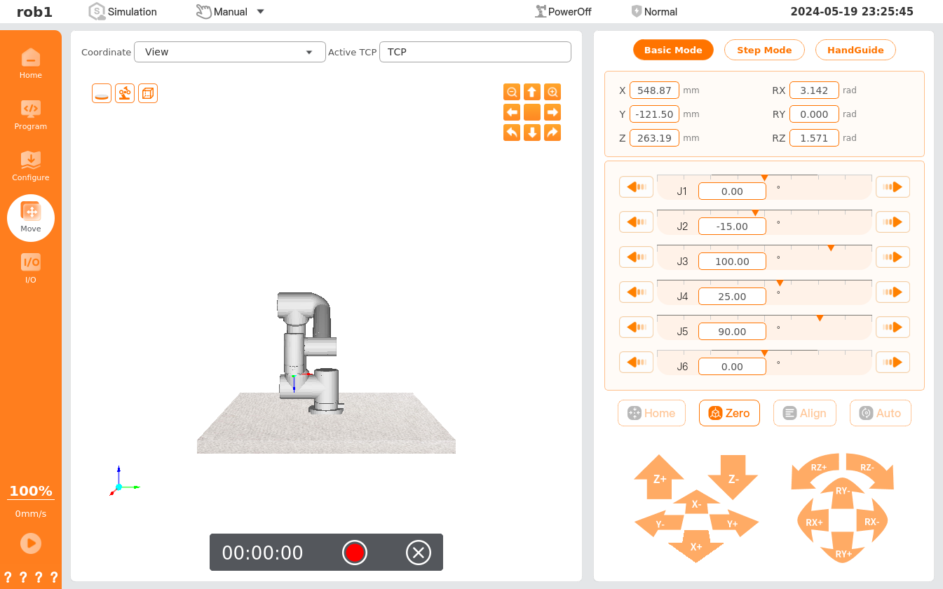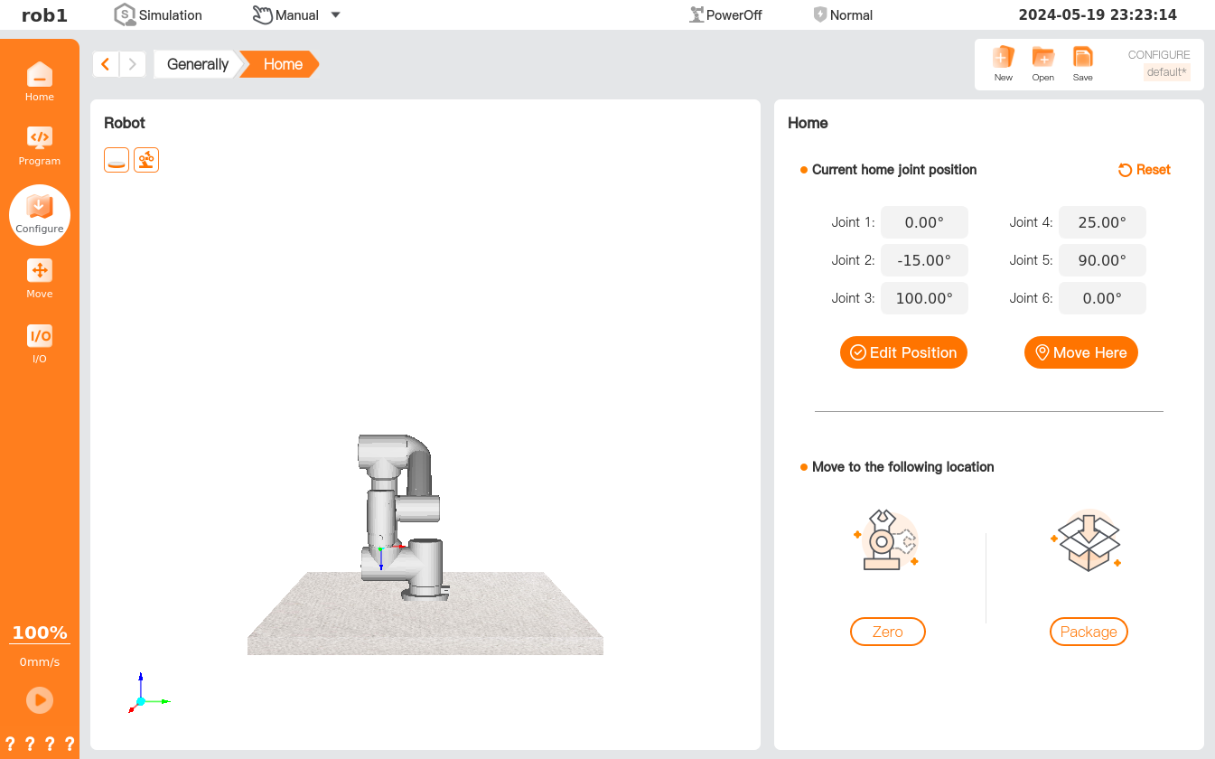 • Zero: Move the robot quickly to the zero position/pose.