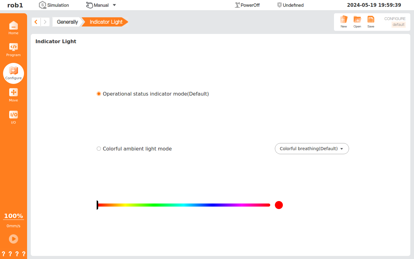 [Indicator Light] allows setting of the mode of the robot indicator light. This function is only supported by some robot arm models. Please refer to the Hardware User Manual for more details.