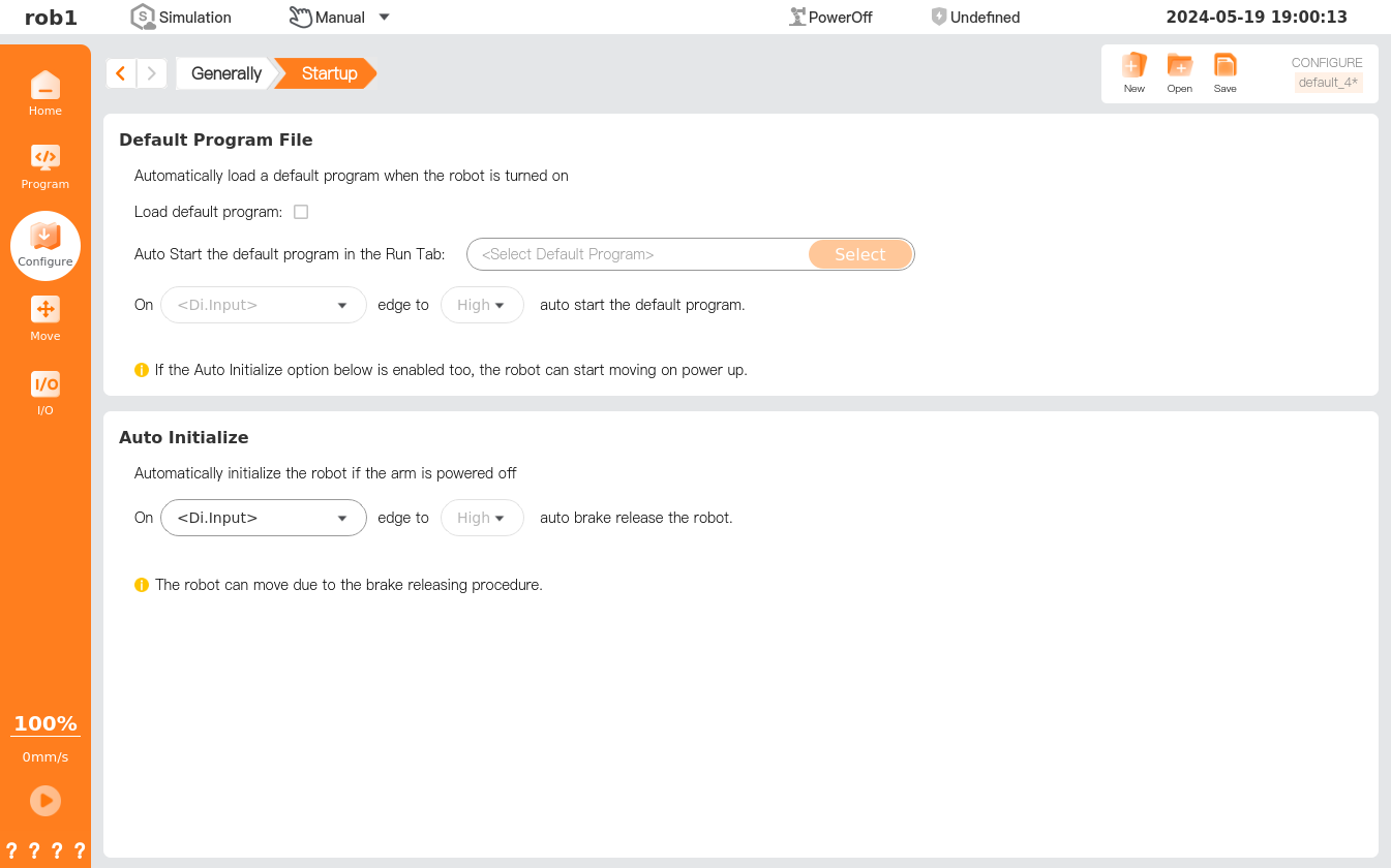 [Start] allows setting of the default program and auto initialization. A default program is a program loaded automatically upon boot of the controller, which is loaded automatically when the system starts running without loading any programs. Auto initialization, i.e., when the robot receives an initialization signal in the power-off state, it will start initialization to restore to the operable status.