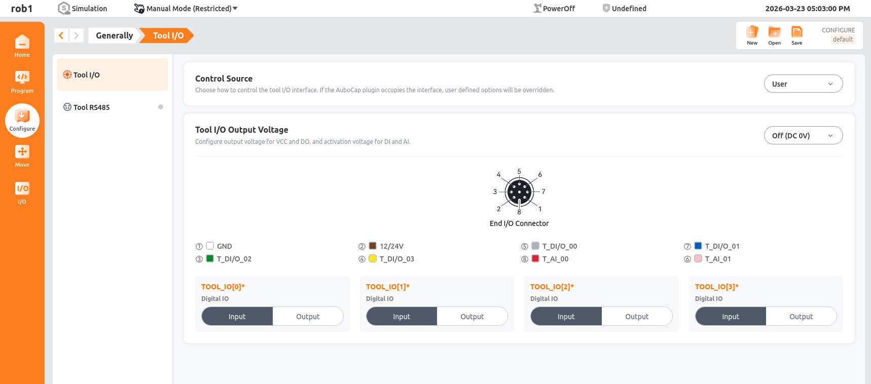 • Tool I/O output voltage: Set the voltage level (in V) for the tool's digital I/O in output mode. After replacing tools or resetting system, please double-check to ensure that the voltage matches the tool's rated voltage.