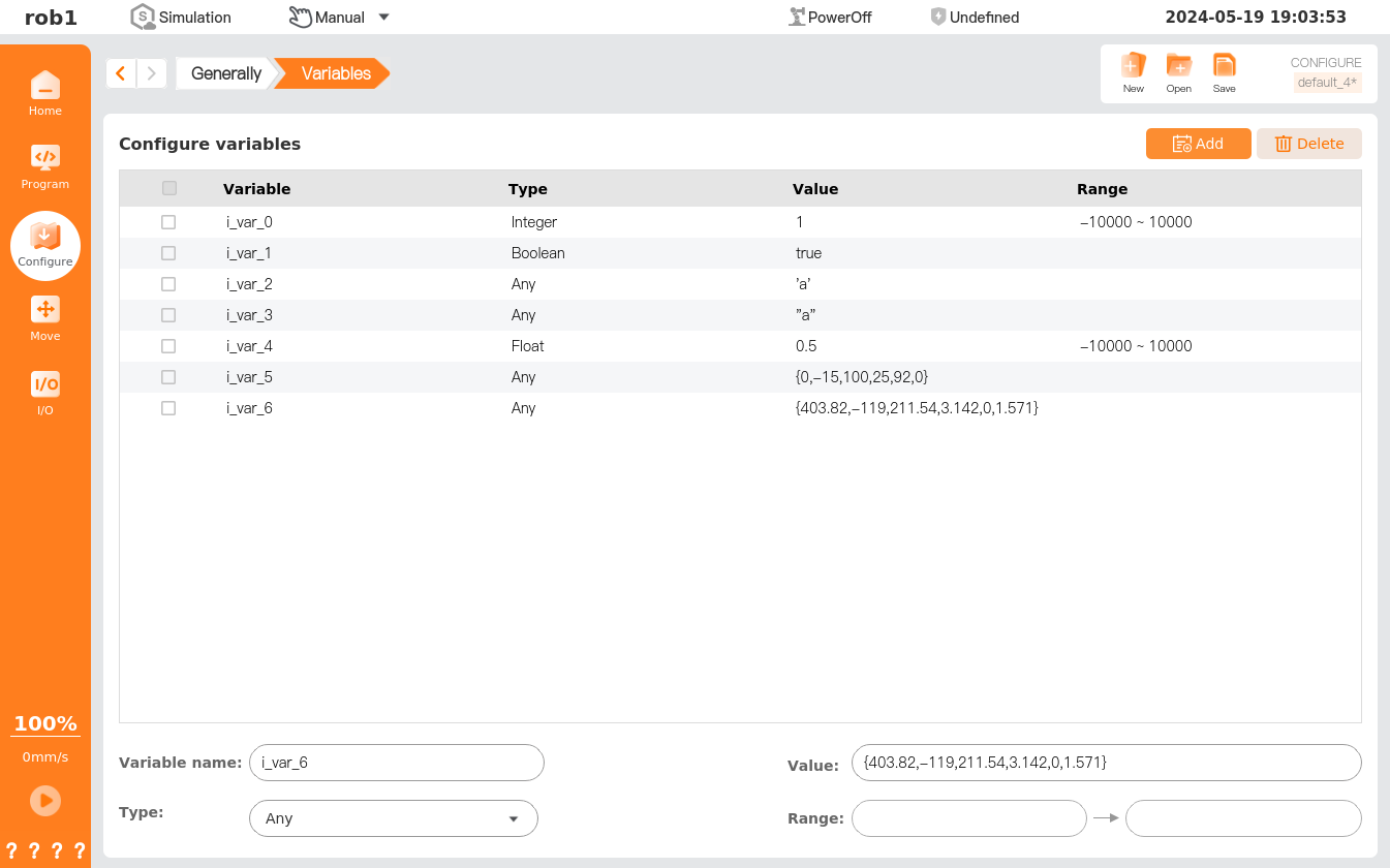 • Configure variables: Such variables can be applied to more than one program, and their names and values persist until the robot is decommissioned. Therefore, they are persistent variables.