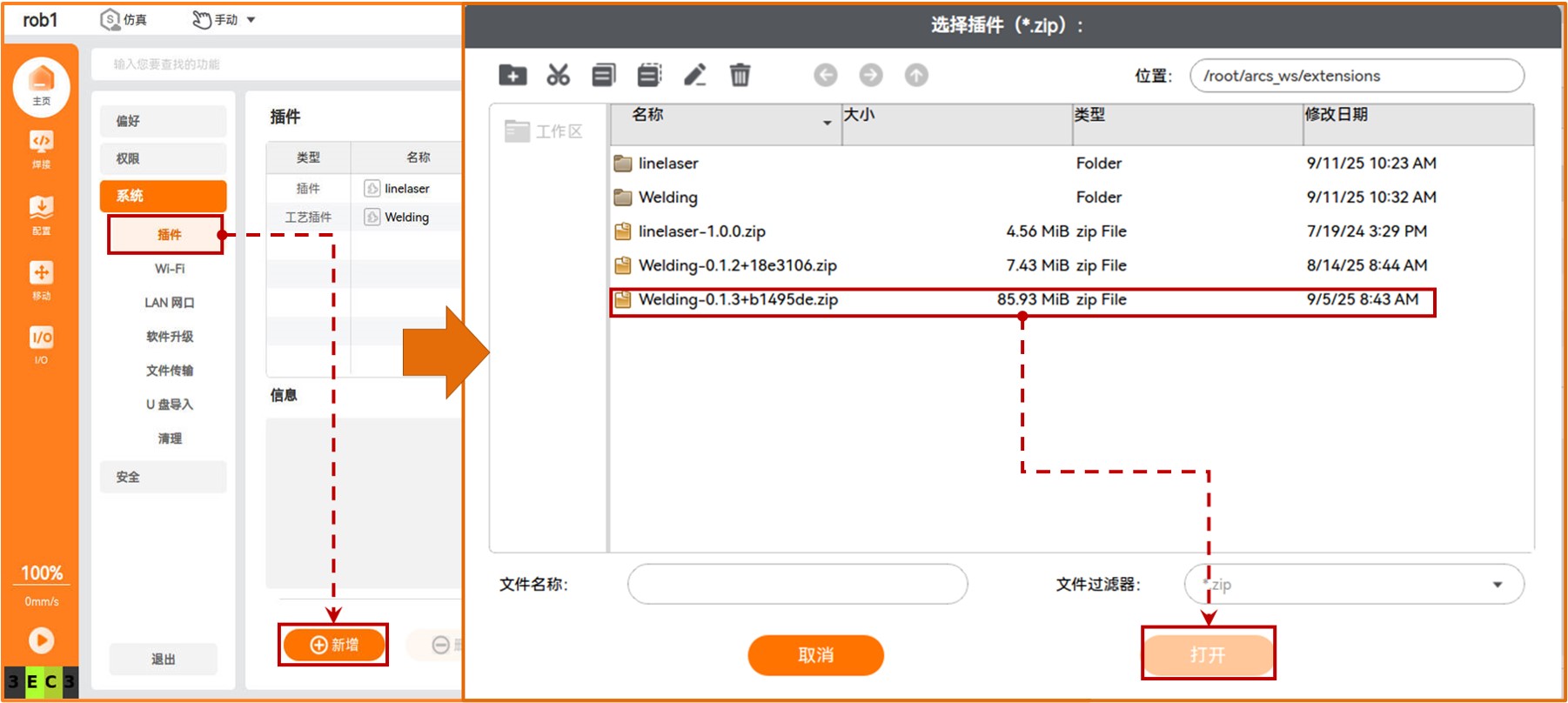 2. 单击【插件】进入插件界面,单击界面左下角的【新增】,选中焊接工艺包文件,点击【选择】导入的焊接工艺包。