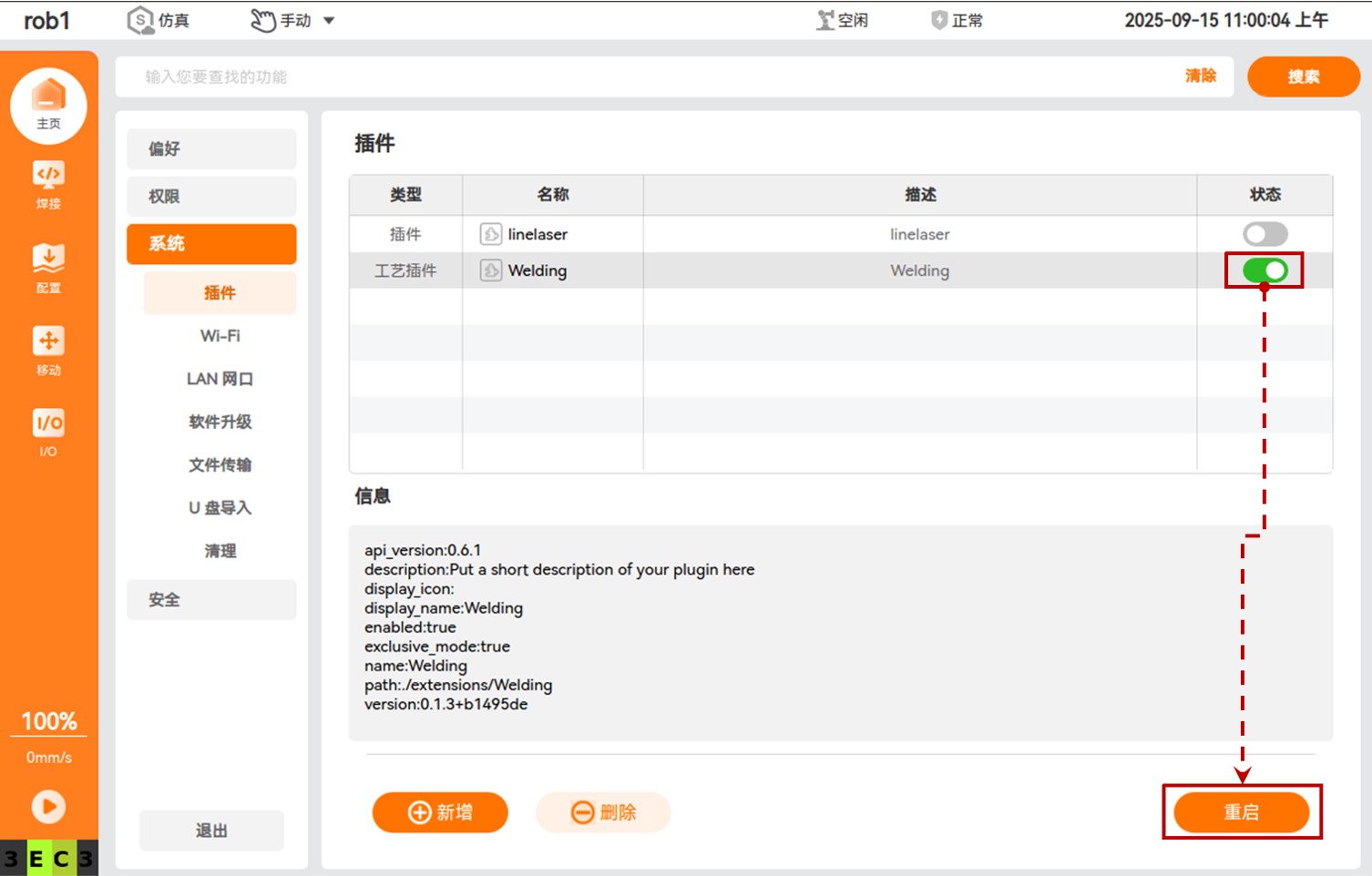 3. 设置工艺插件 “welding” 插件的状态按钮为绿色,单击【重启】重启控制柜。
