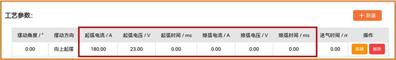 点击【新建】可增加工艺参数,点击【编辑】可设置工艺参数,工艺参数设置完成后可勾选或取消【默认参数】,勾选完成后,需要点击【保存】,焊接参数设置完成。