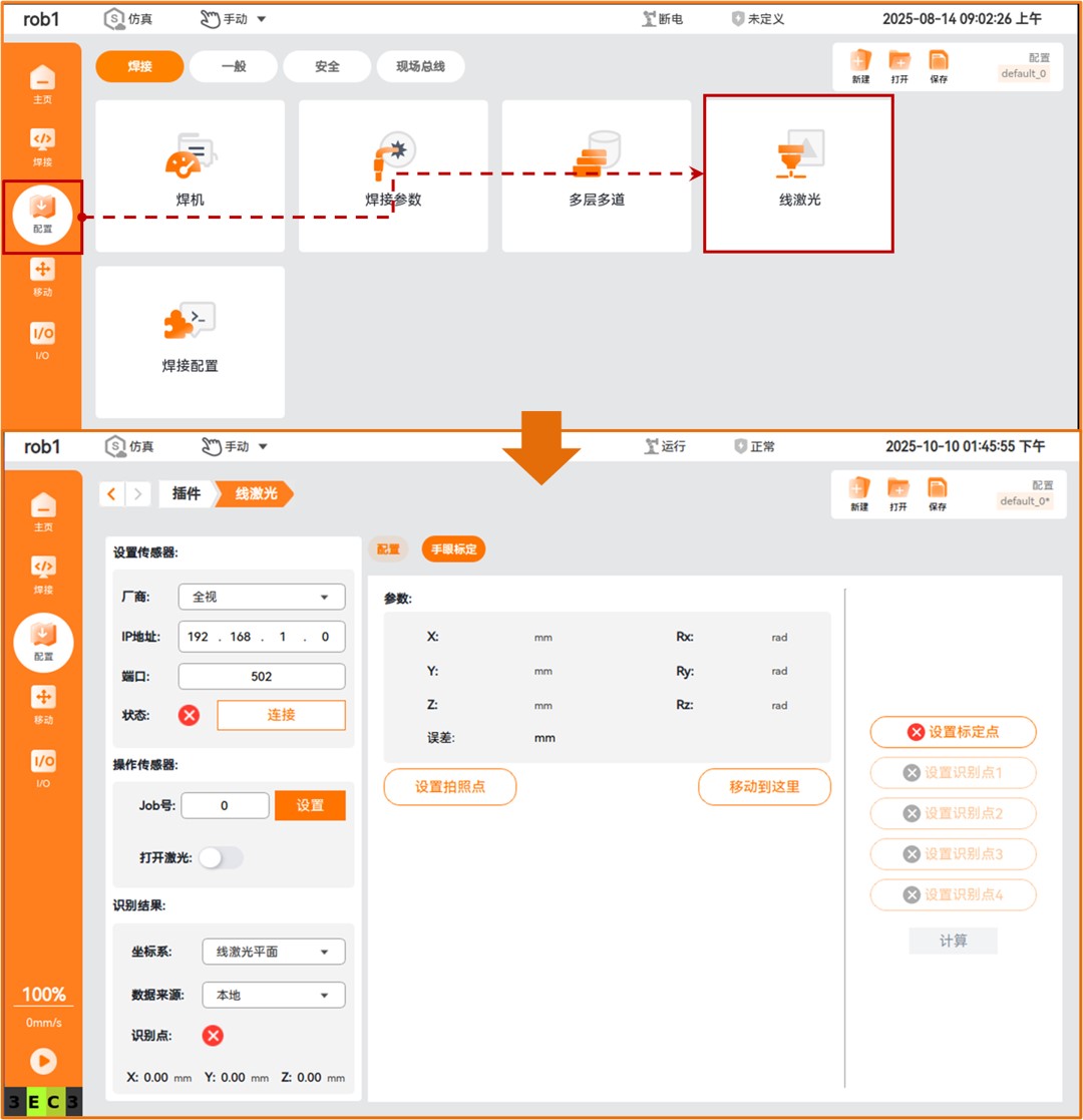 点击【线激光】进入线激光配置界面,该界面左边包含三个模块:“设置传感器”、“操作传感器”、“识别结果”,右边包含两个模块:“手眼标定”、“配置”。