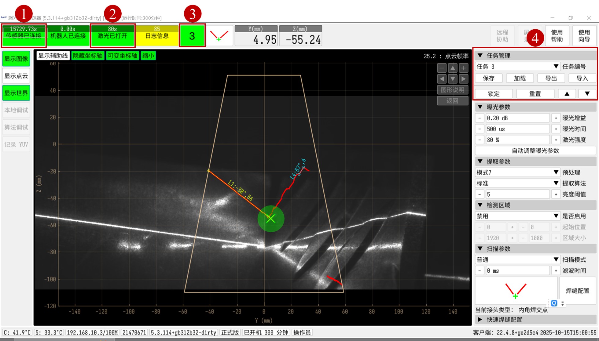 将激光照射在需要识别焊缝表面且使相机能识别光条,设置设置好job号与传感器位置后,传感器识别到特征点识别结果如下所示。