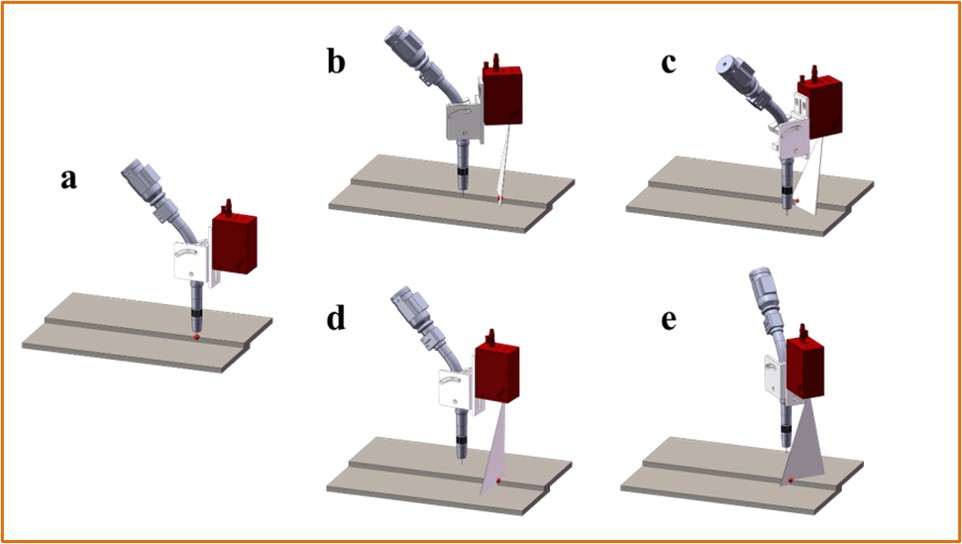点击【手眼标定】进入如下界面,首先设置标定点,将TCP末端执行器尖端触碰标定点如a所示,然后机械臂用四组不同的位姿使得传感器激光照射在标定点上并识别到标定点,如bcde所示。设置好标定点和识别点后,点击【计算】手眼标定完成。