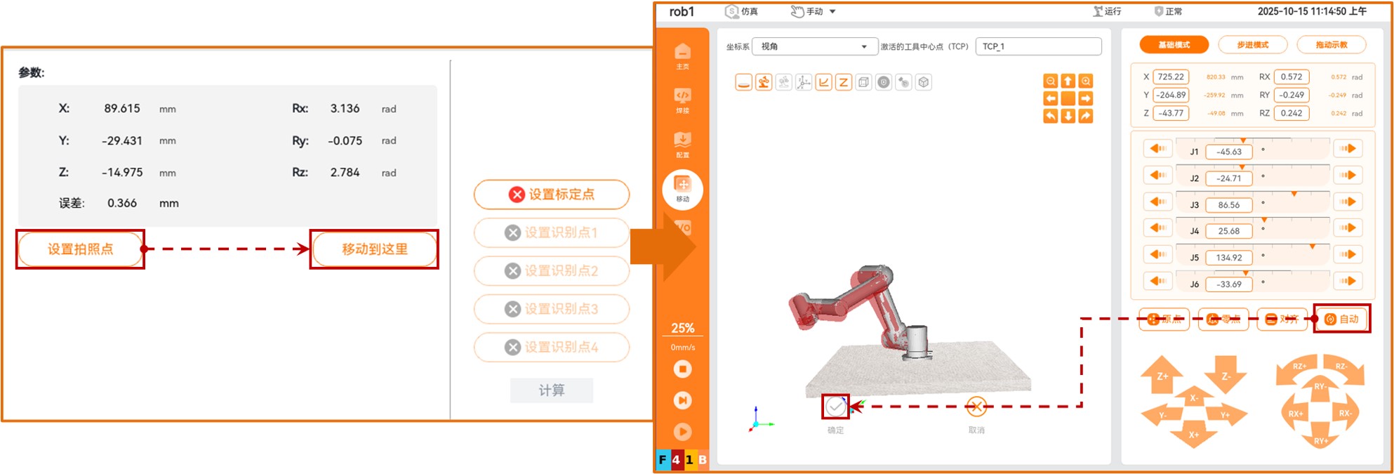 手眼标定完成后,将激光照射在对应job号的焊缝类型上同时观察传感器识别结果是否识别成功,识别成功后依次点击【设置拍照点】->【移动到这里】,长按自动机械臂运动到识别点,验证手眼标定的精度是否符合使用需求。