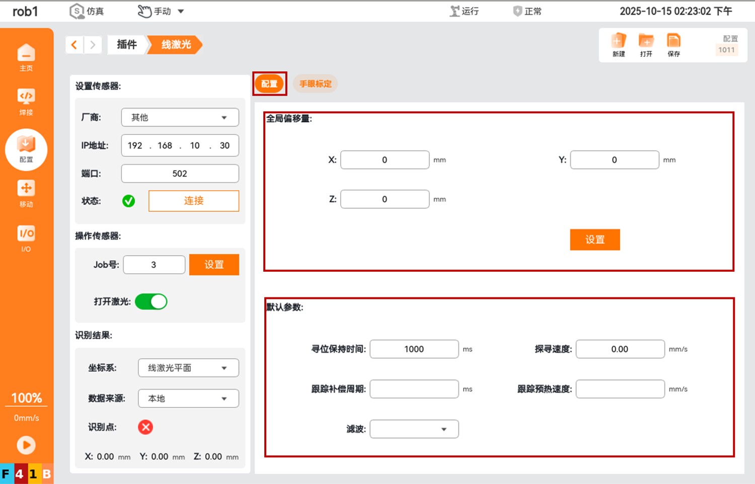 手眼标定完成后,点击【配置】进入如下界面,该界面包含两部分:“全局偏移量”、“默认参数”。