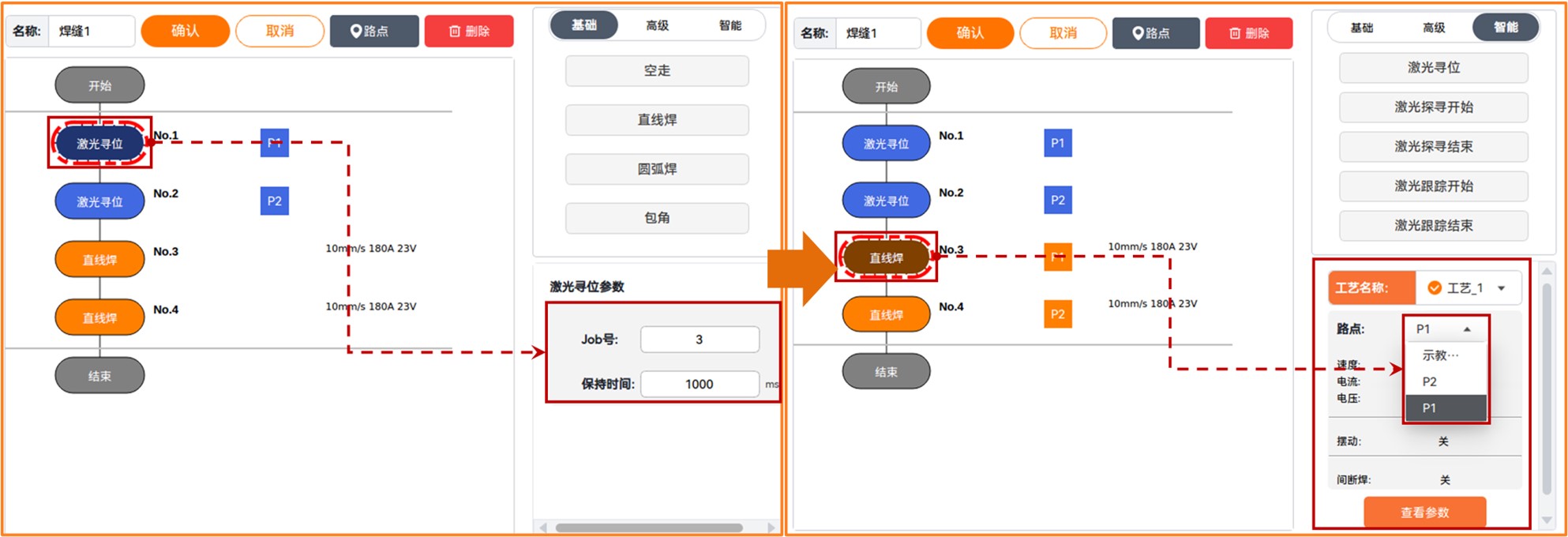 设置好激光寻位的位姿后,激光寻位参数中的job号为对应的焊缝类型的job号,保持时间为寻位保持时间。寻位得到的焊缝点储存在变量P中。以直线焊为例,通过激光寻位得到直线焊的起点和终点,然后将直线焊的路点分别设为激光寻位得到的P1和P2。