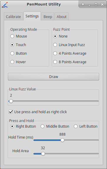 单击【开启触摸校准】按钮,弹出触摸屏校准软件窗口。单击 “Settings” 选项卡,在 “Operation Mode” 选择 “Touch”。