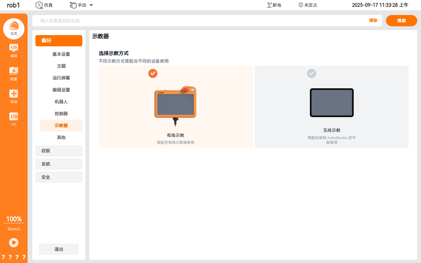 【示教器】可以设置机器人的示教方式,不同示教方式需配合不同的设备使用。