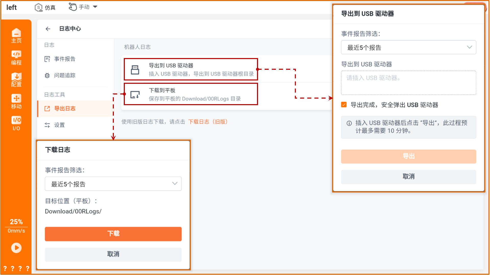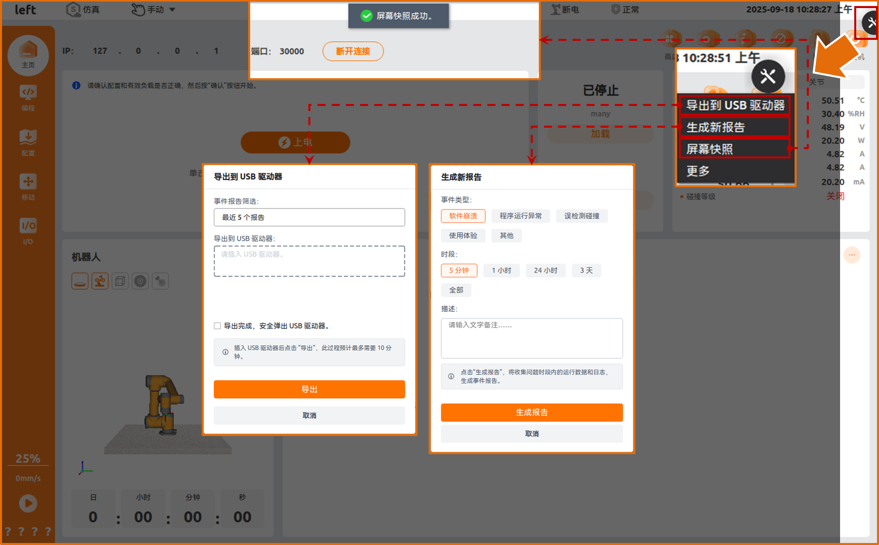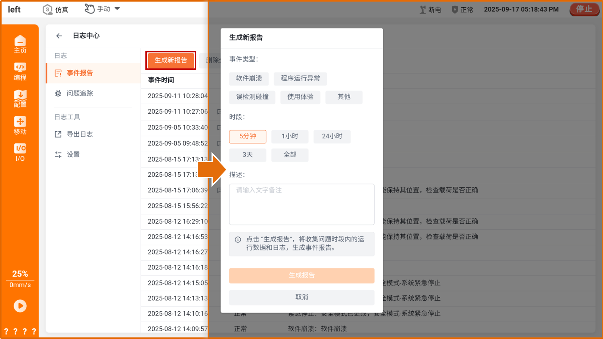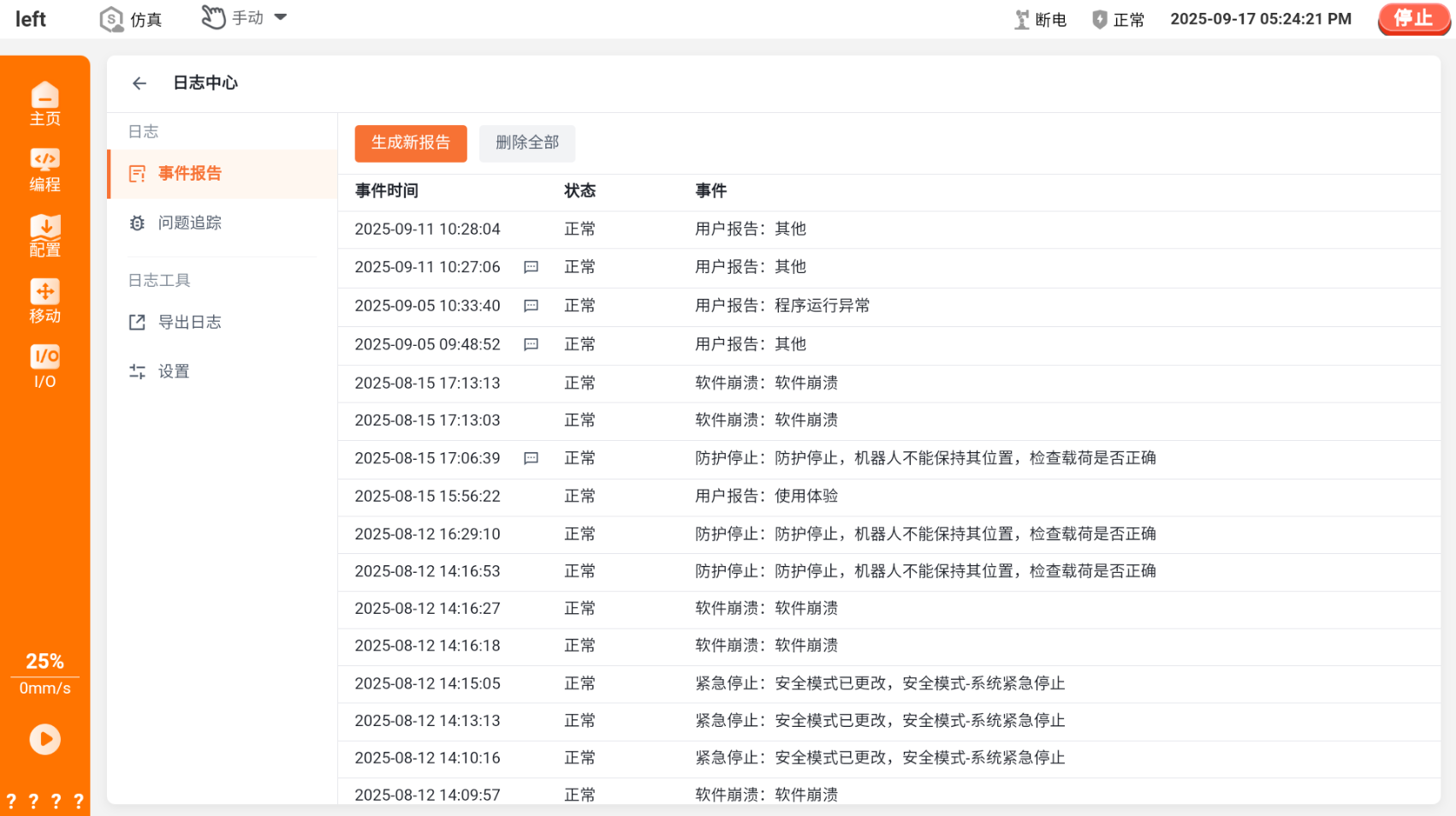 事件报告的生成有两种途径,当系统监控到某些异常后会自动生成事件报告,比如碰撞、触发保护性停止、软件崩溃等。这时候只需要等待事件报告生成结束,下载使用即可。也可以手动生成事件报告。