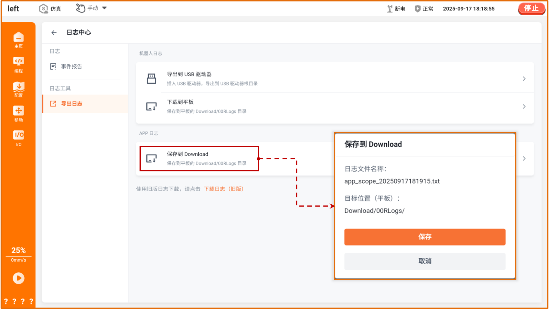 AuboStudio APP 0.9.4 之后的版本,用户可以直接在平板的 Download/00RLogs/ 目录中下载客户端日志。