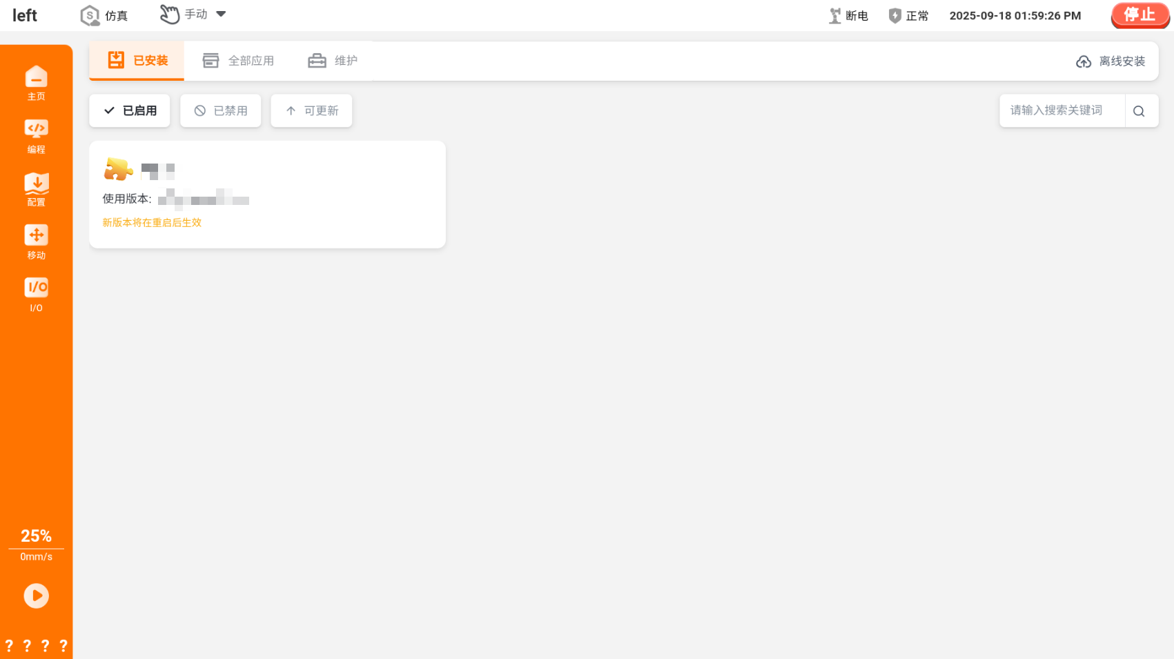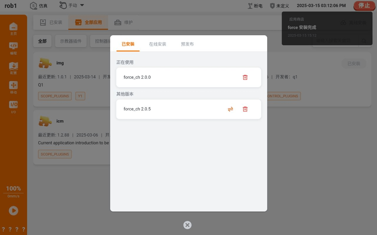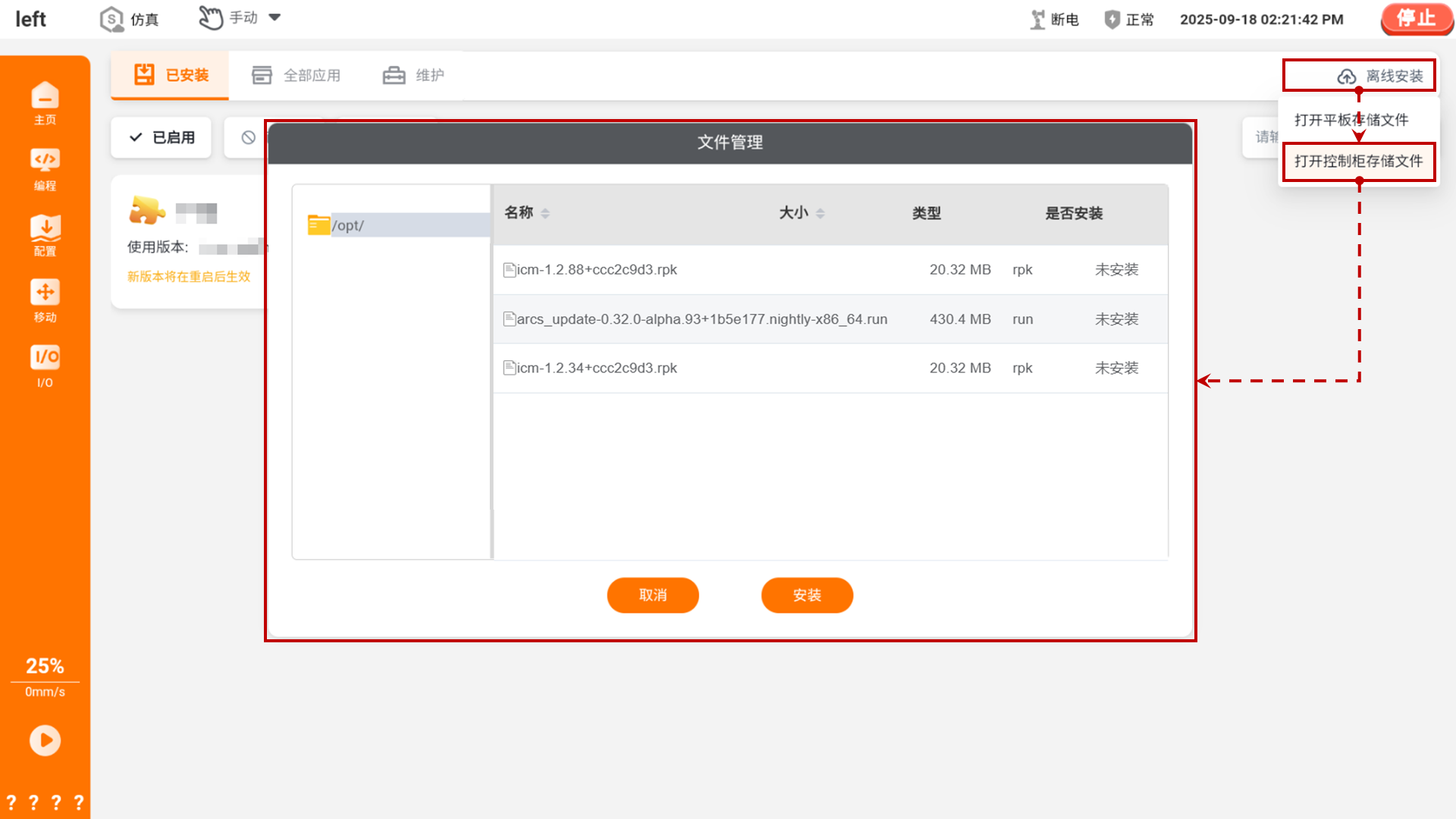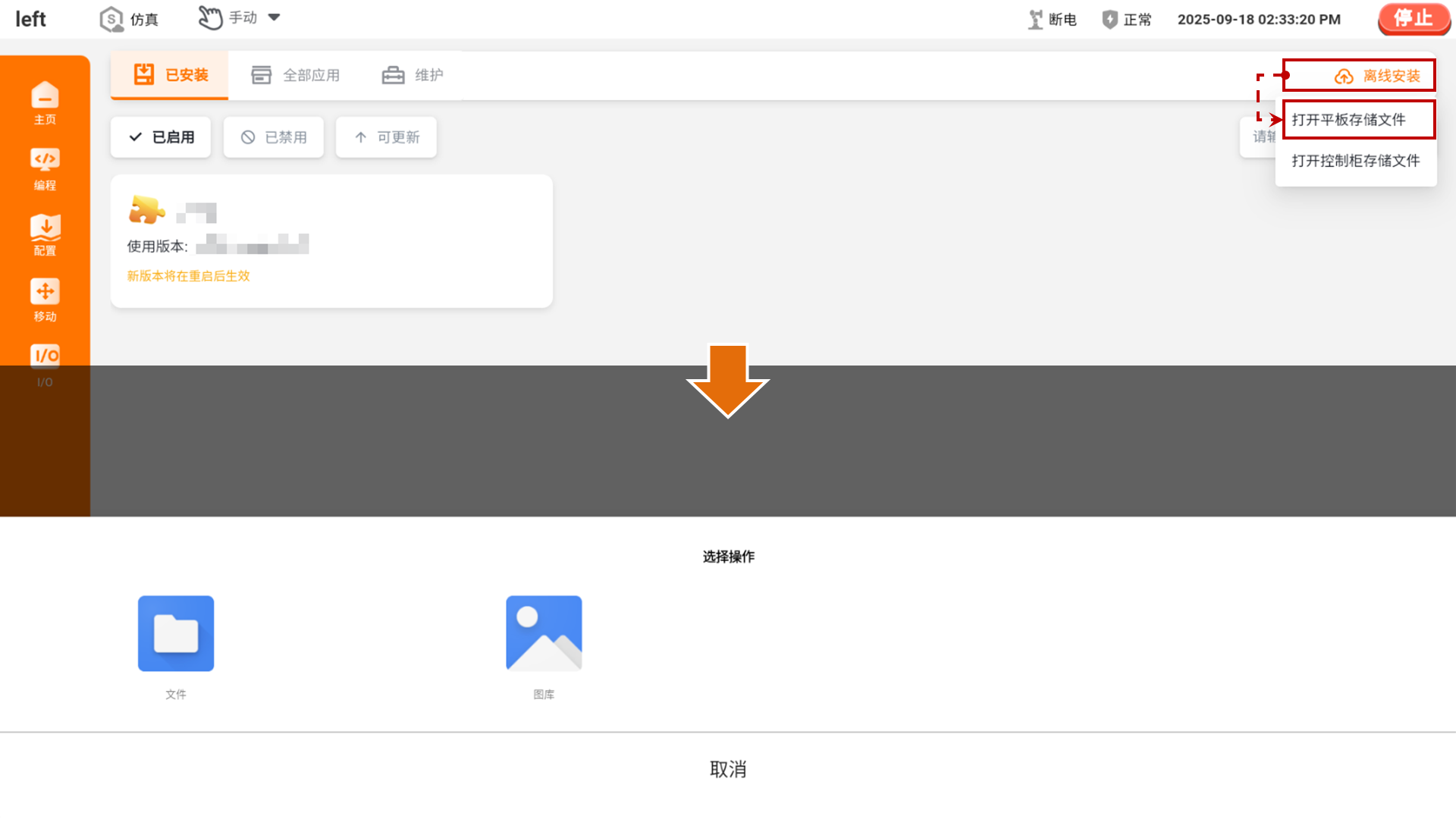 用户可以将应用安装包上传至控制柜或平板中,在顶部菜单栏的右侧使用 “离线安装” 功能安装。