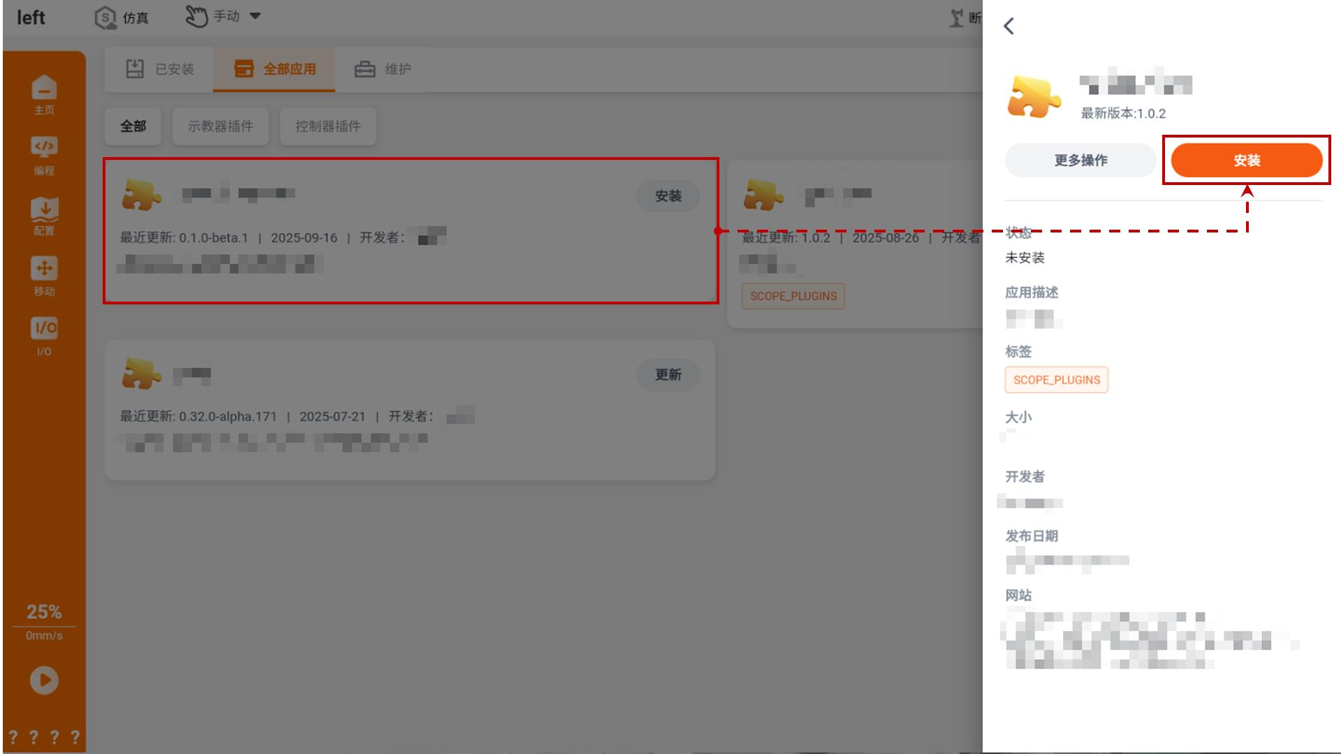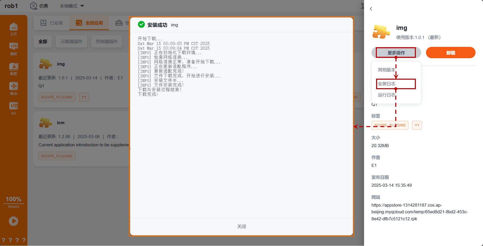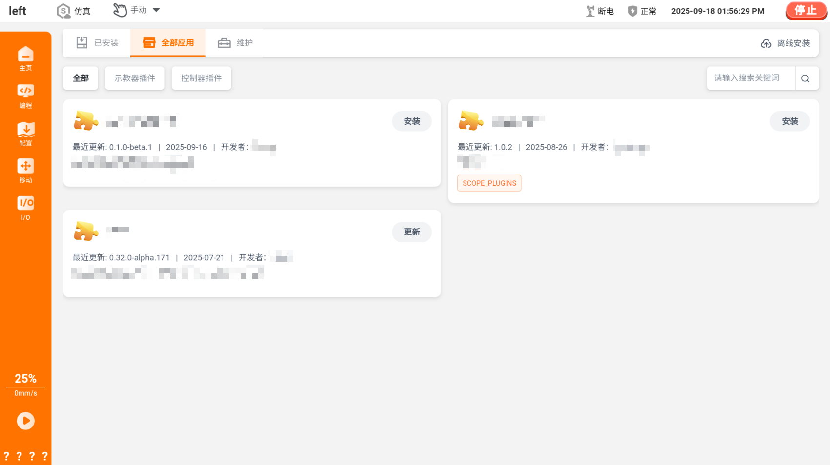 用户可以将应用安装包上传至控制柜或平板中,在顶部菜单栏的右侧使用 “离线安装” 功能安装。