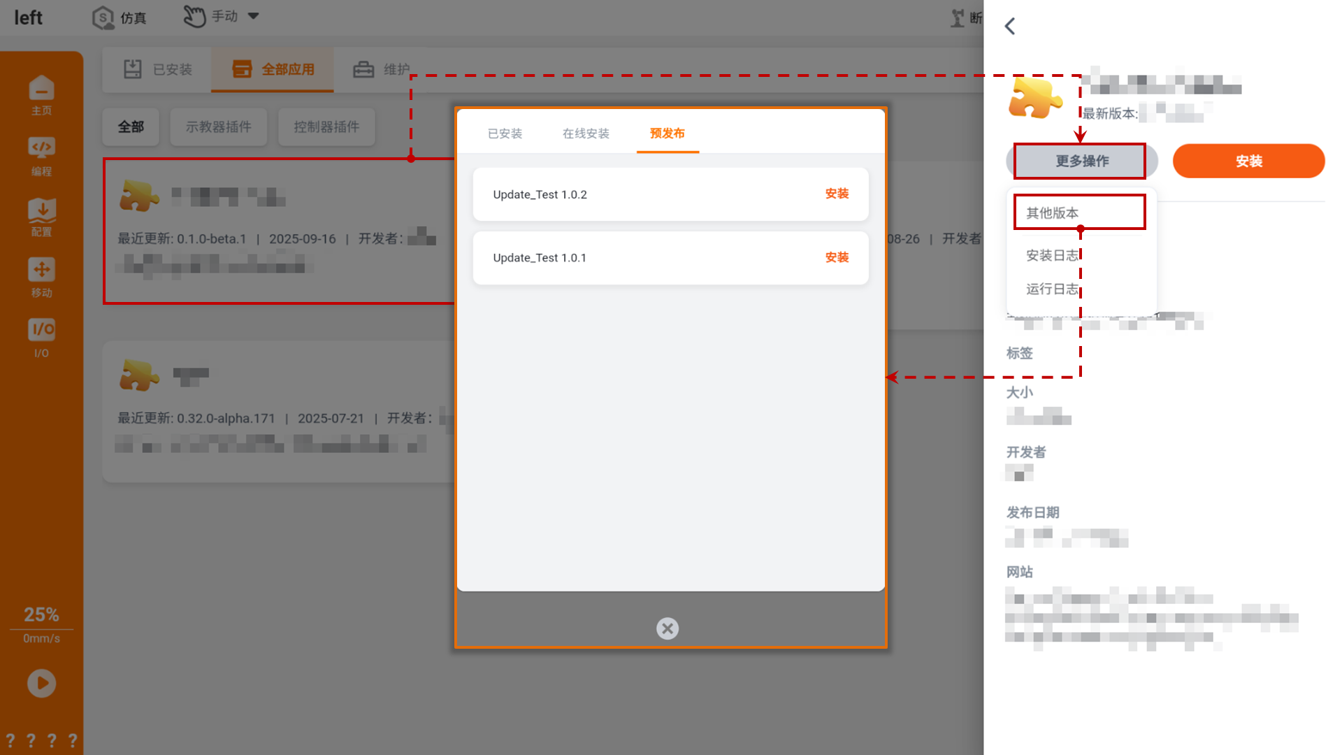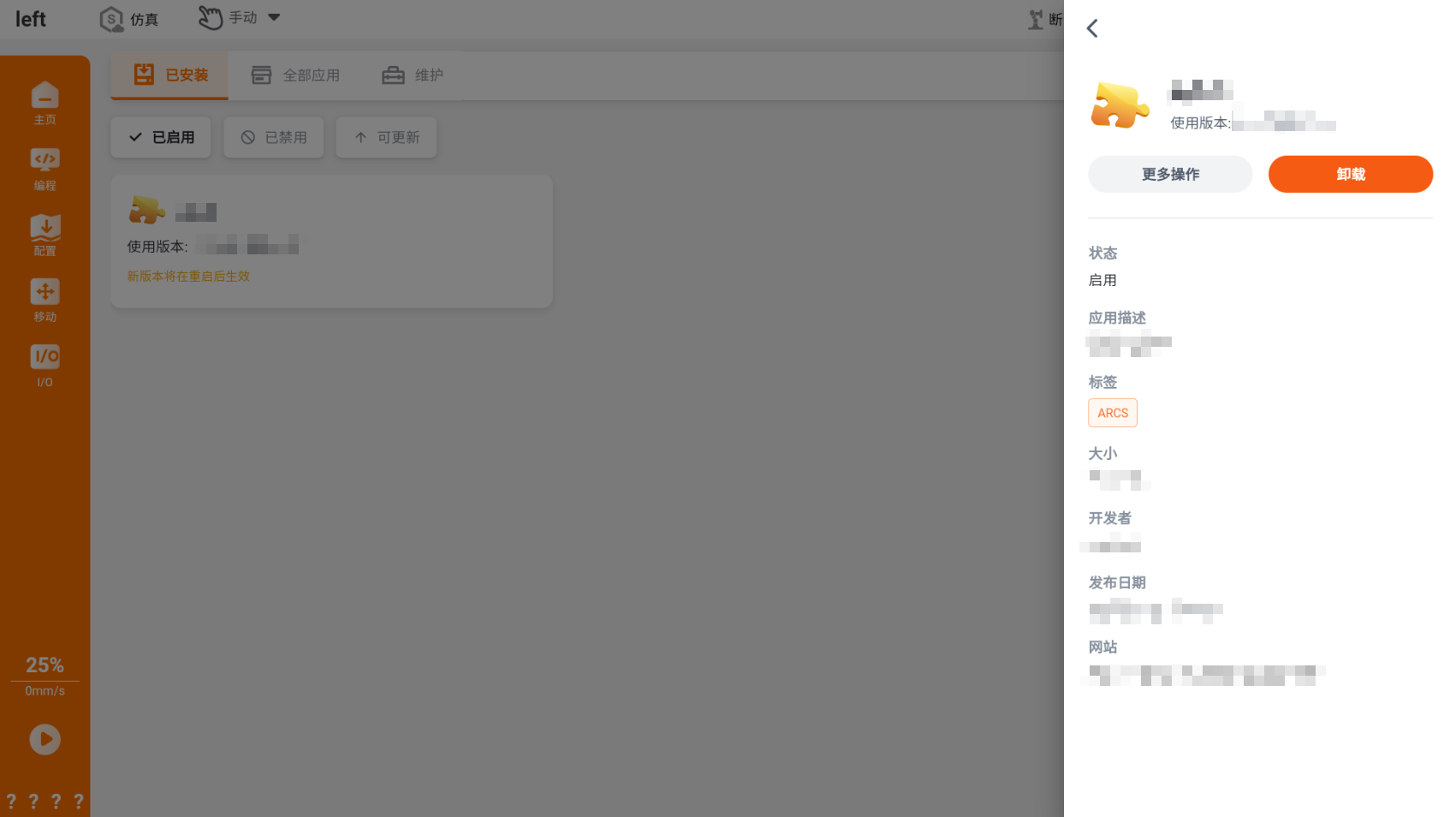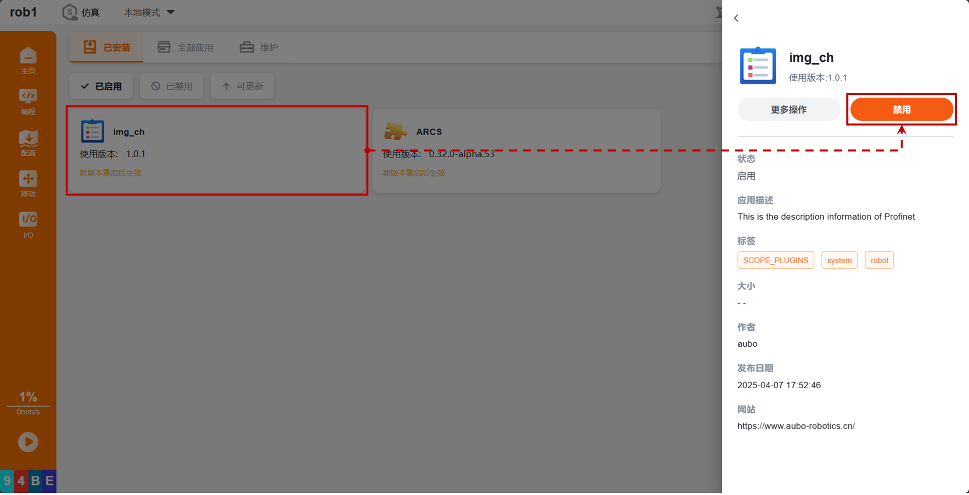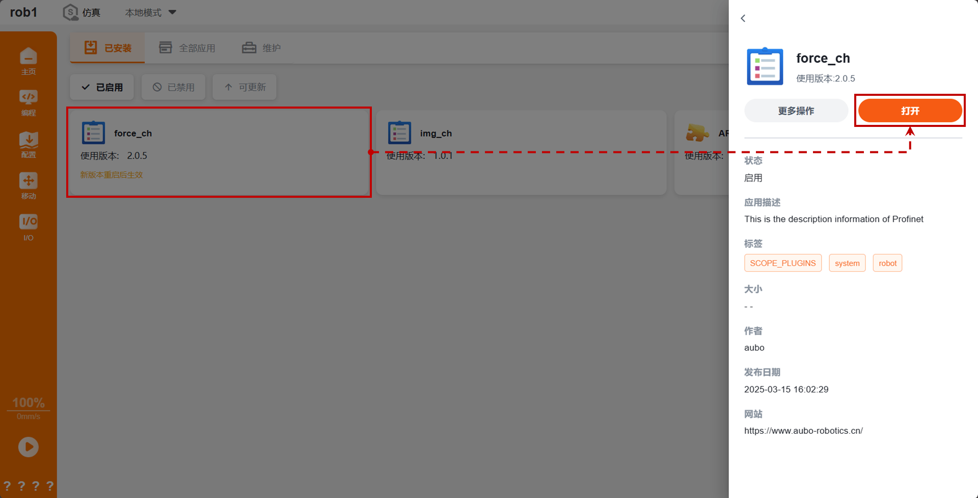 用户可以将应用安装包上传至控制柜或平板中,在顶部菜单栏的右侧使用 “离线安装” 功能安装。