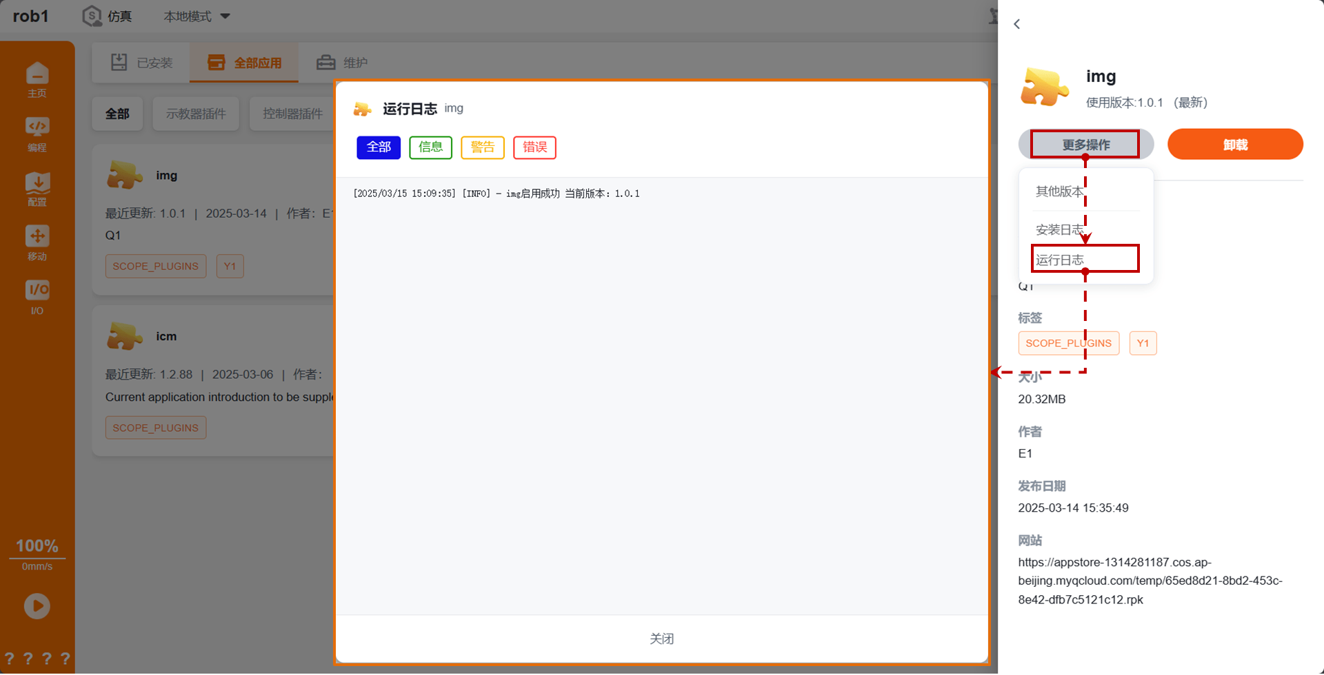 运行日志中记录所有操作,且支持按照日志级别筛选。单击应用卡片弹出应用抽屉页面,选择 “更多操作 > 运行日志” 查看。
